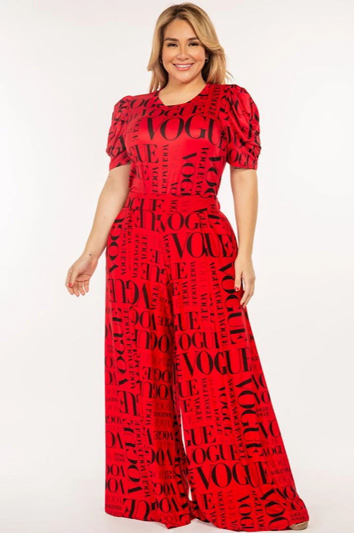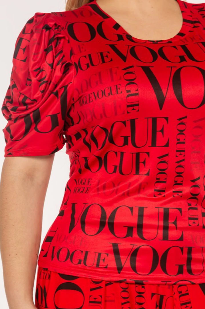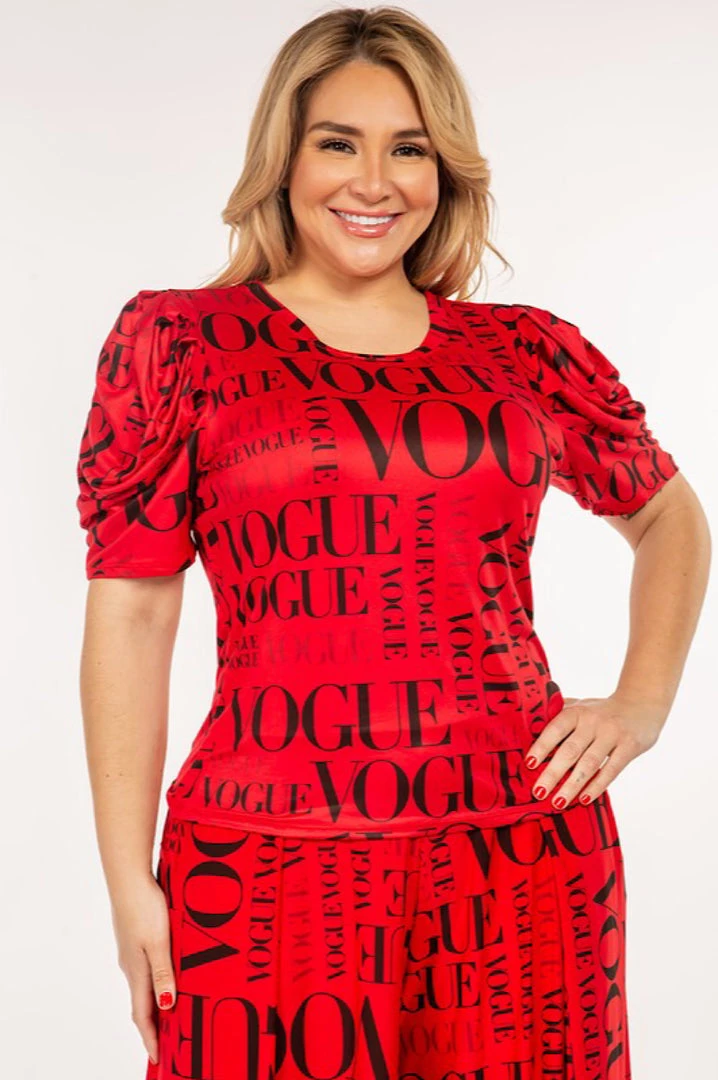 Red black Vogue print top only. Tops and pants sold separately. Your closet should always have pieces you can wear with anything and look great; and there is no better example of that than this fitted puffy sleeve top. Top is very fitted in the bodice and the sleeves are slightly puffed with ruching detailing. We recommend going up one size if you are top heavy and carry more weight in your bust and stomach and if you don’t like too fitted. This top is designed to be fitted. Shirt is short waist so it looks best with high waisted pants or skirts. Fabric has a lot of spandex and stretch. Material is polyester and spandex blend and feels like a cotton tee with stretch. Model has on size xlarge with her bust measurements at 42D and waist measurements at 38 inches. Xlarge is 14/16. Made in the USA. Model is 5 feet 8 inches tall. Ships from Houston, Texas by Social Butterfly Collection.
