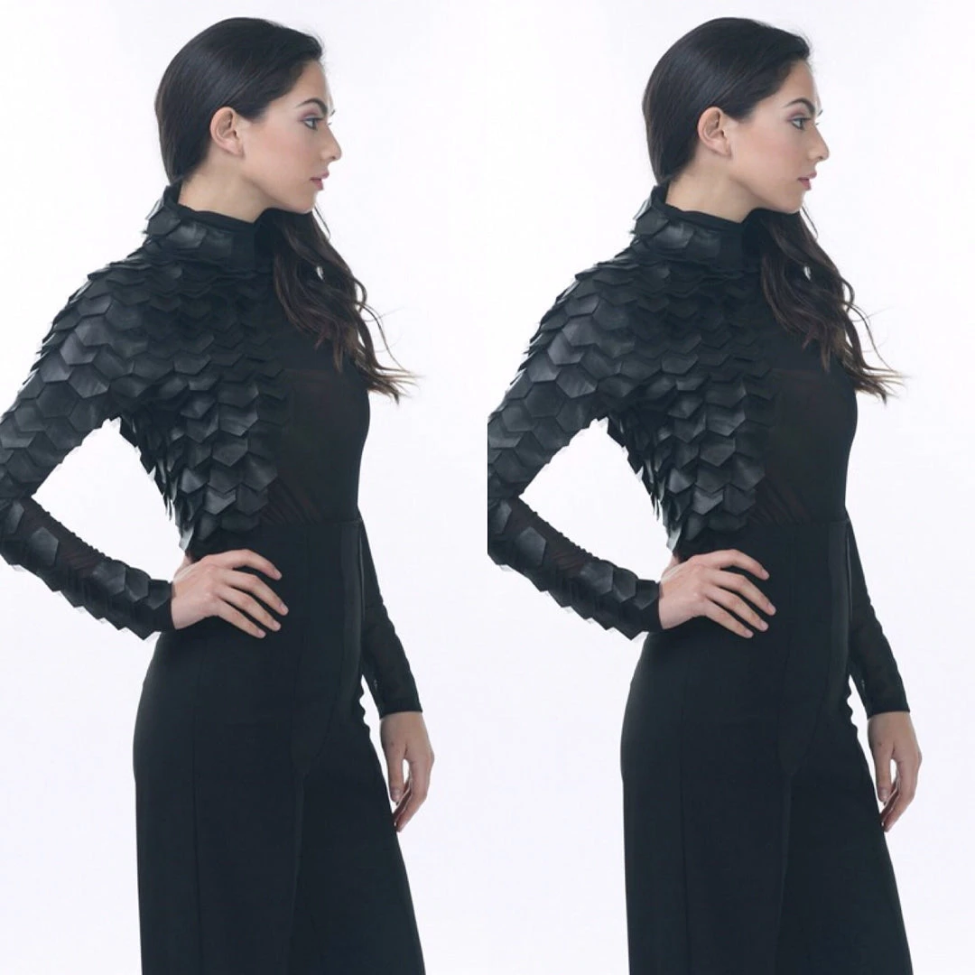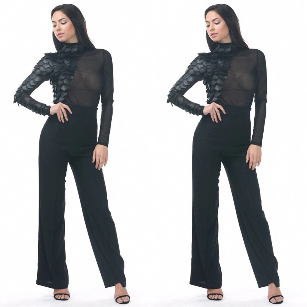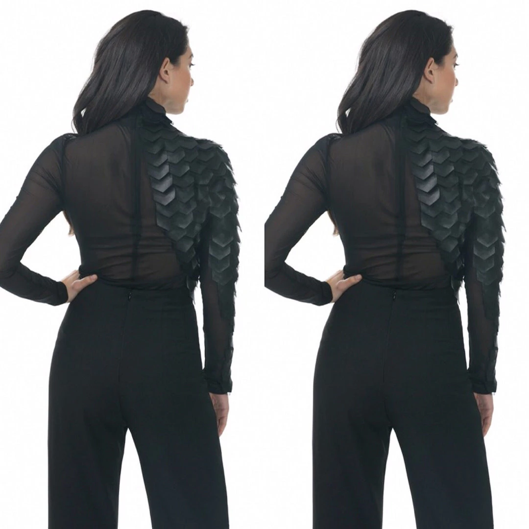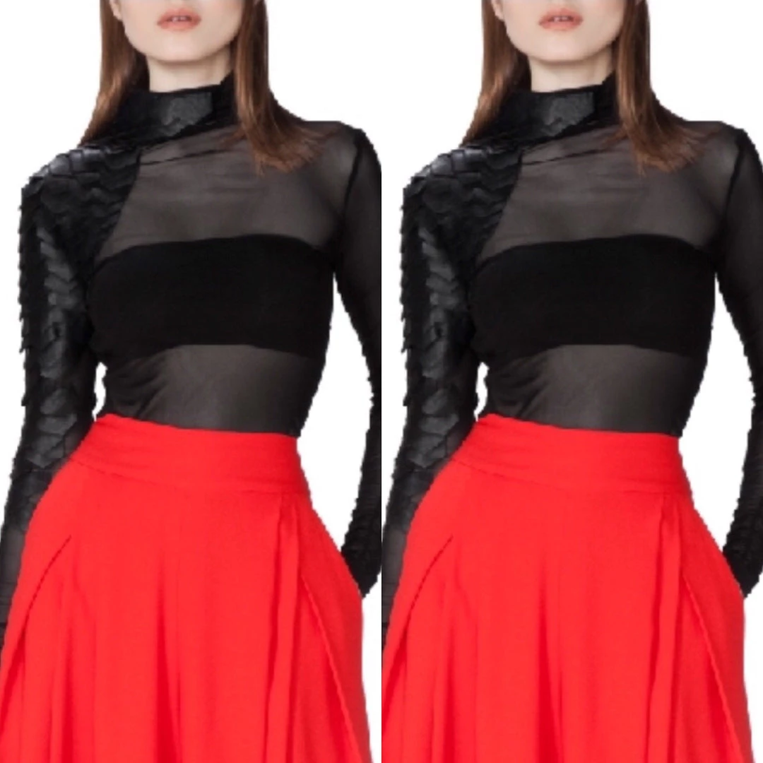Absolute must have bodysuit. The fabric is SHEER see through. Black mock turtle neck with one faux leather sleeve. This bodysuit is very edgy and is sure to be a conversation piece. Fabric feels great and is light weight to wear year round. Fabric is 95% Polyester and 5% Spandex with great stretch. Material looks and feels like soft cotton. It is sheer or see through. Lady with black skirt has sheer bodysuit on as well but the lighting and angle of the photo allows the top to look not so sheer as some of the other photos. Please know that you will receive the sheer version of this bodysuit. At one time, we did offer the non sheer version but we no longer offer this bodysuit in the non sheer version. You will need to wear a camisole or black bra. Black tube bra not included.