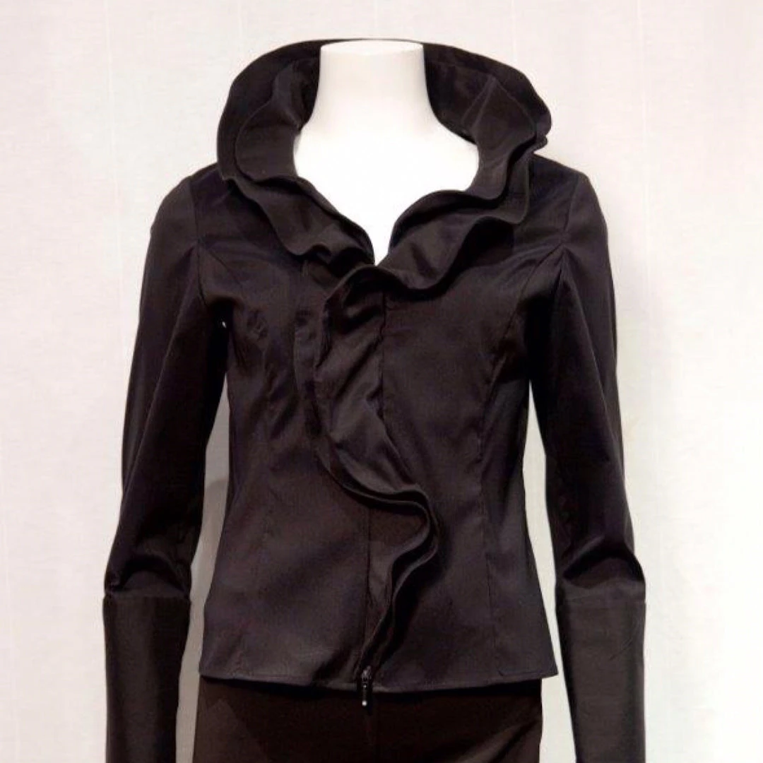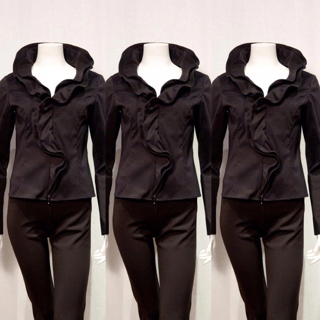 Water resistant dupioni fabric with wire ruffle neckline. The perfect top for any dressy or holiday outfit. The ruffle style draws your eyes to the smooth neckline, and the rest of the top fits like a glove so you look shapely and smooth. Long sleeves with French cuffs and top has front zip closure. Fabric has spandex with good stretch. Top fits very true to size. Ships from Houston, Texas by Social Butterfly Collection.