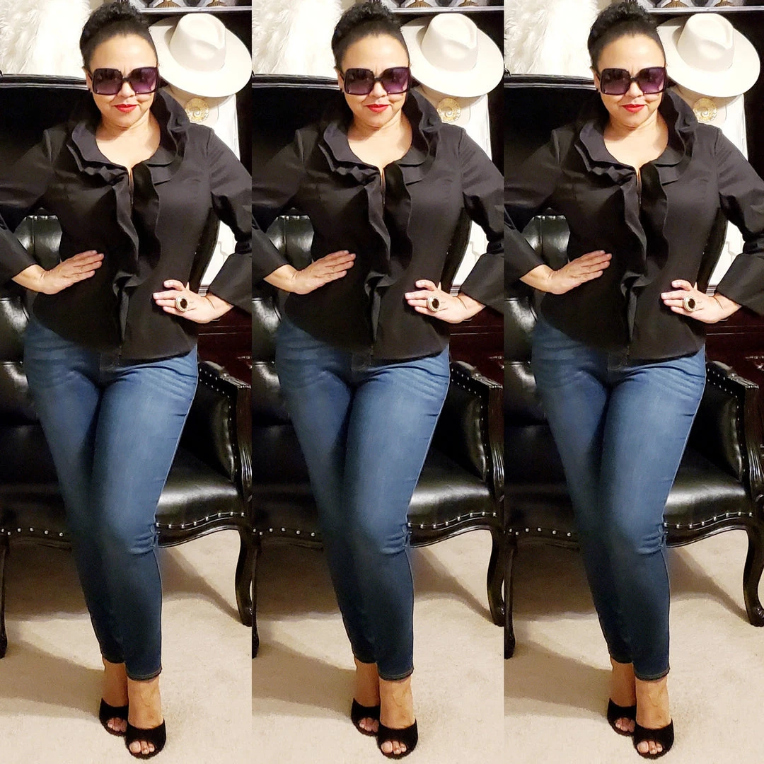 Social Butterfly Collection Sale Fancy Black Ruffle Neckline Top