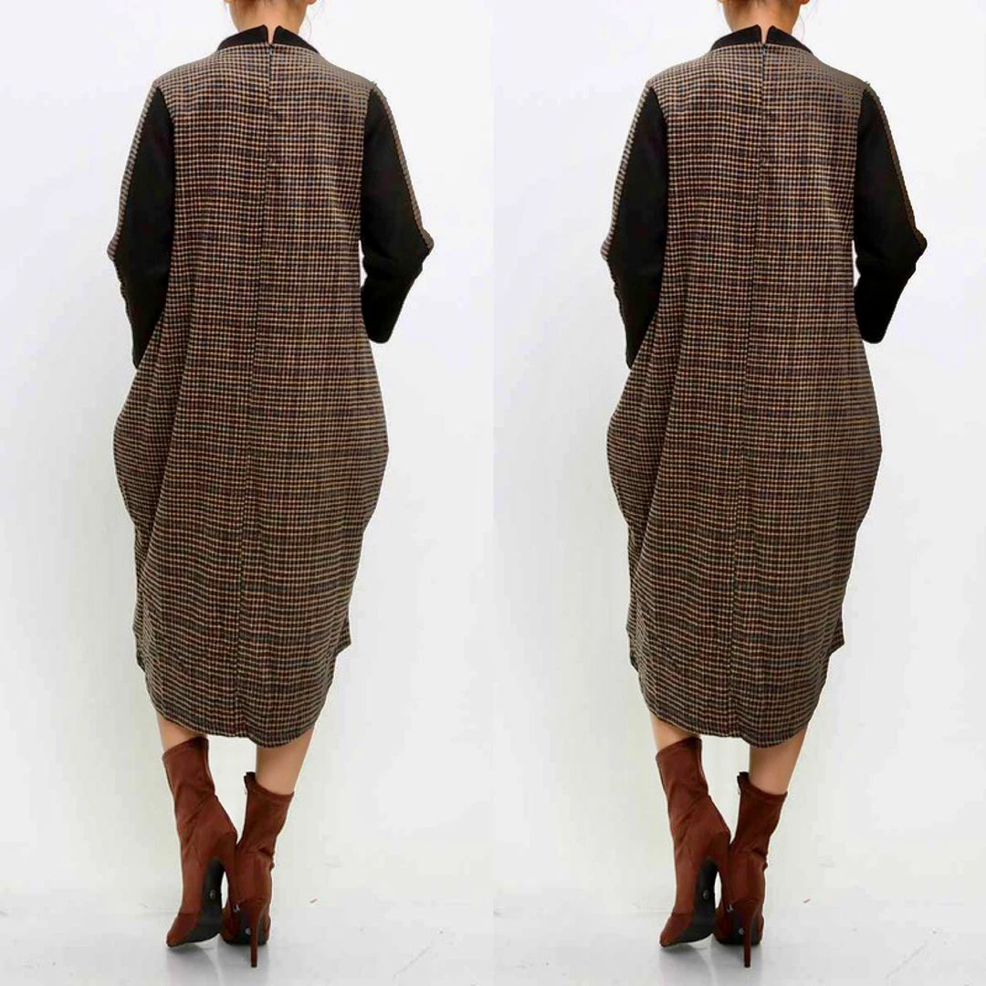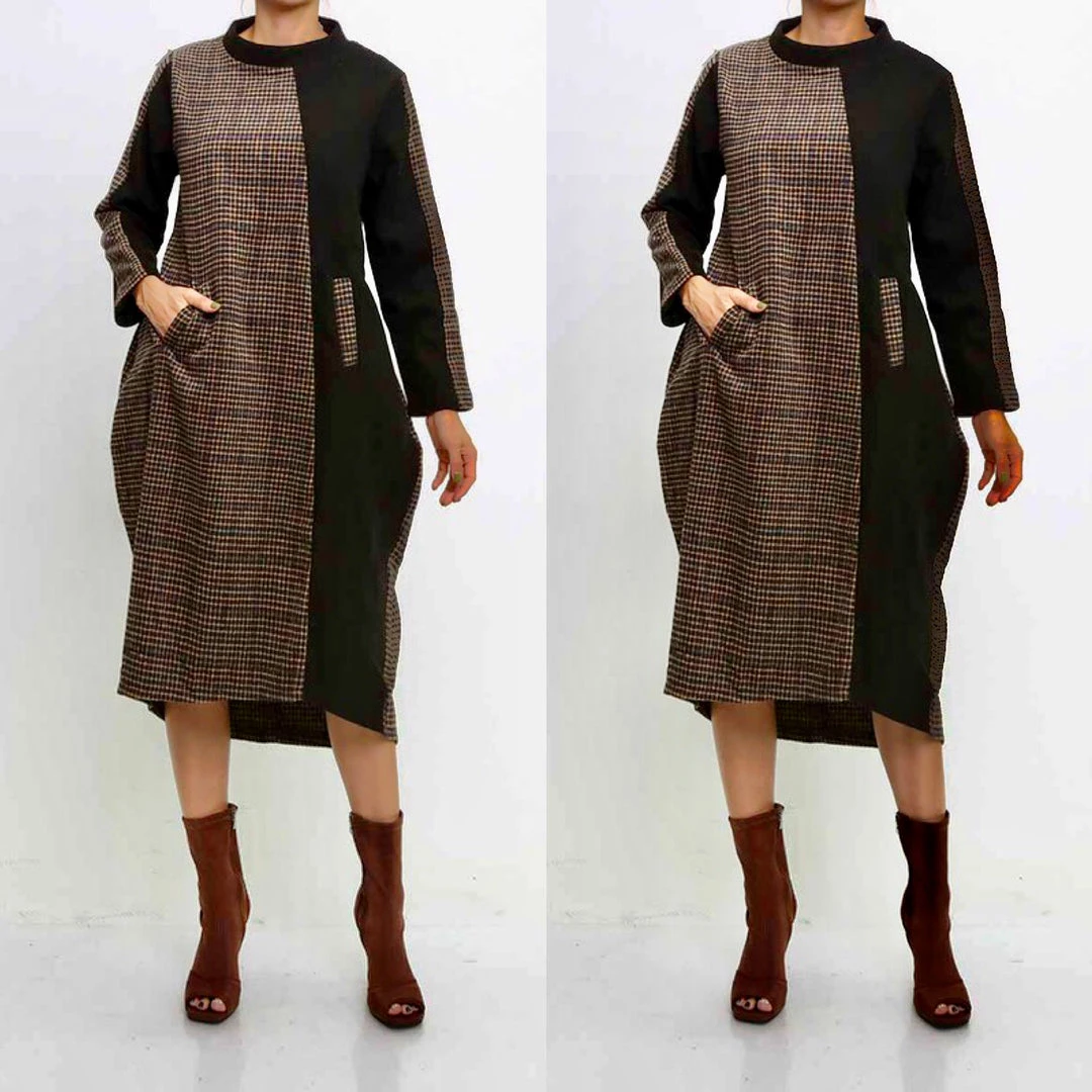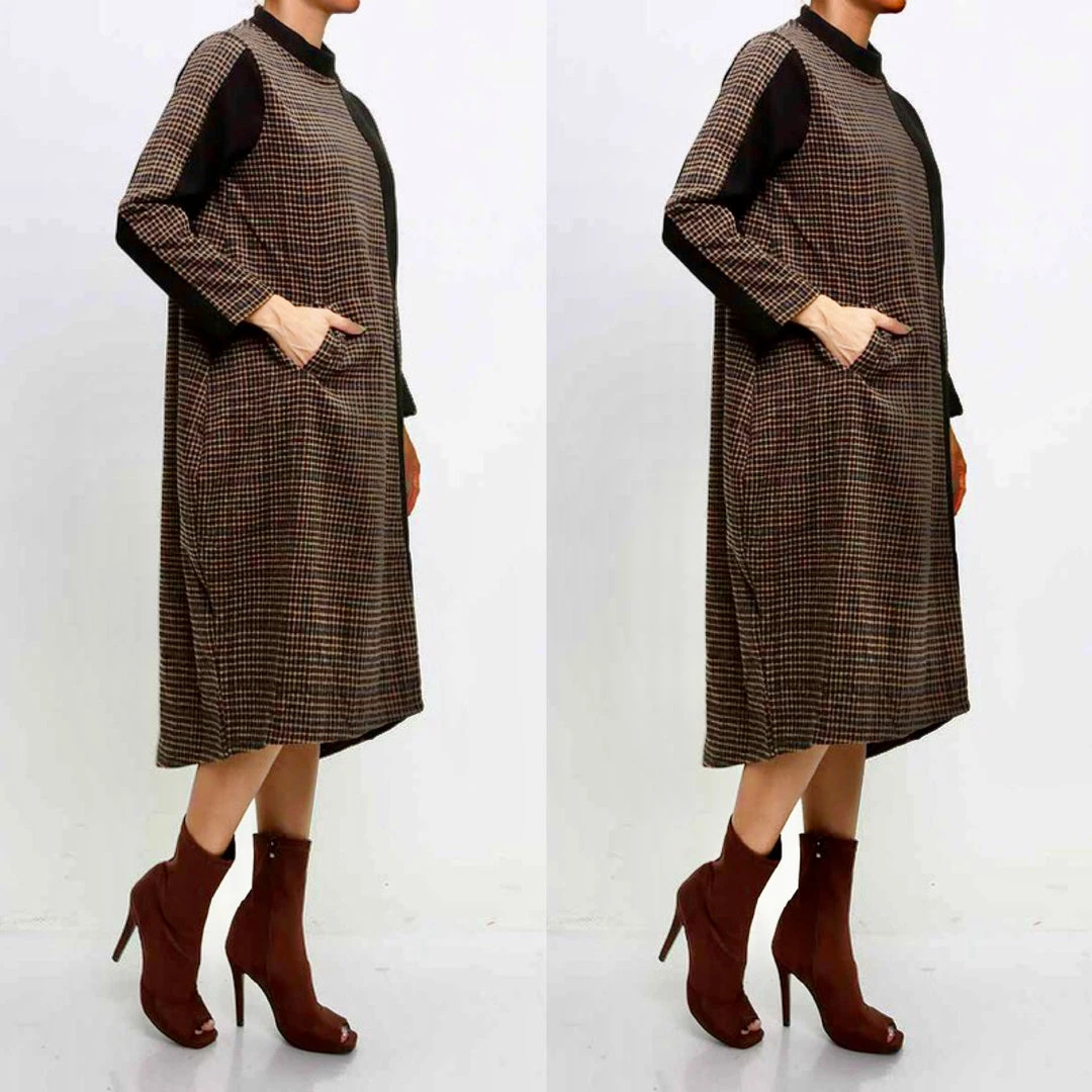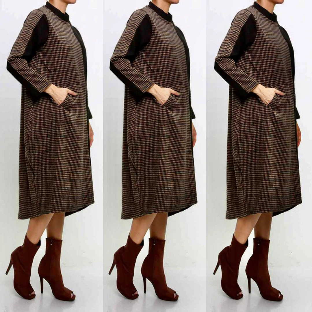 Perfect for day or night wear, this black, check and plaid color block dress is a easy look and it fits a wide variety of body types to make you look chic and comfy. Fabric is a heavy weight winter fabric wool blend material perfect to wear for those cold winter days or nights. Fits true to size and falls at the knees with high low hemline. Dress feels great on and material of the lining is soft and cozy against your skin. Lining makes the wool blend easy to wear. Neckline is a mock neck that fits at or around the neck. Sleeves are long and look great pushed up around the elbows. Front pockets. Ships from Houston, Texas by Social Butterfly Collection.