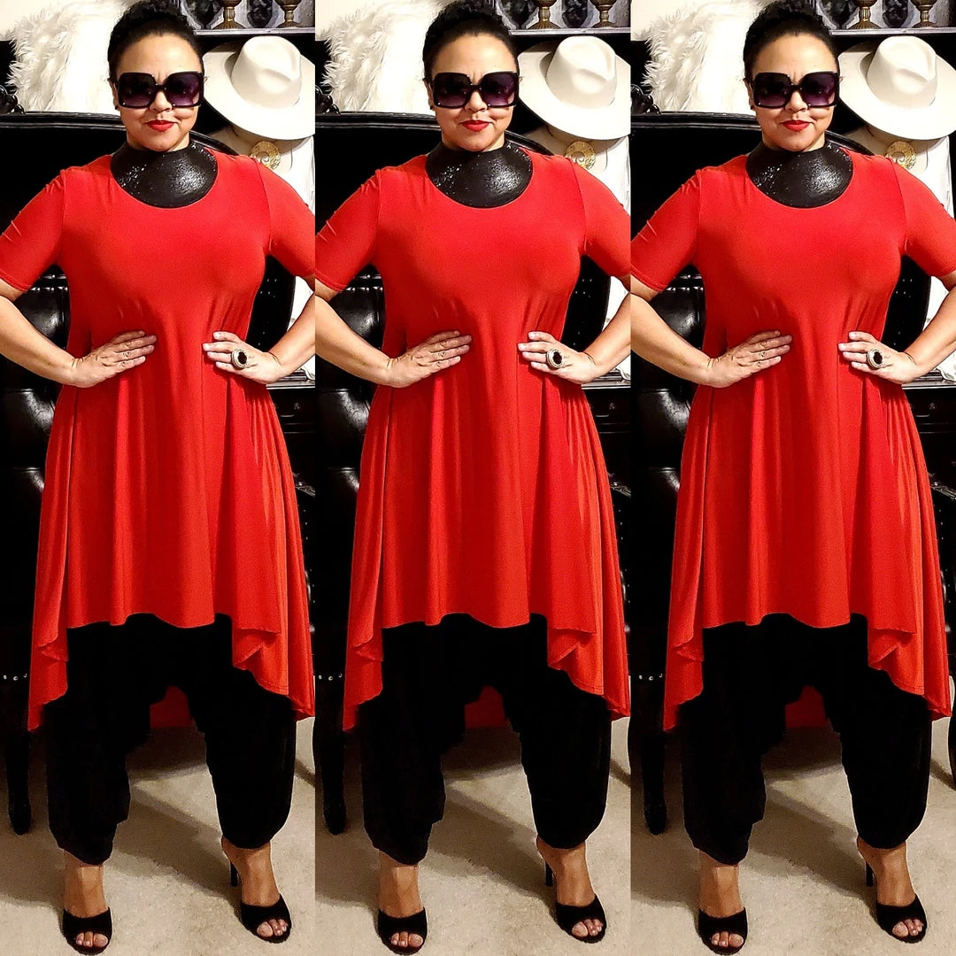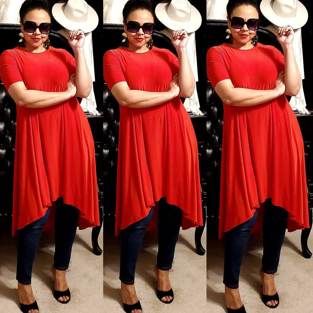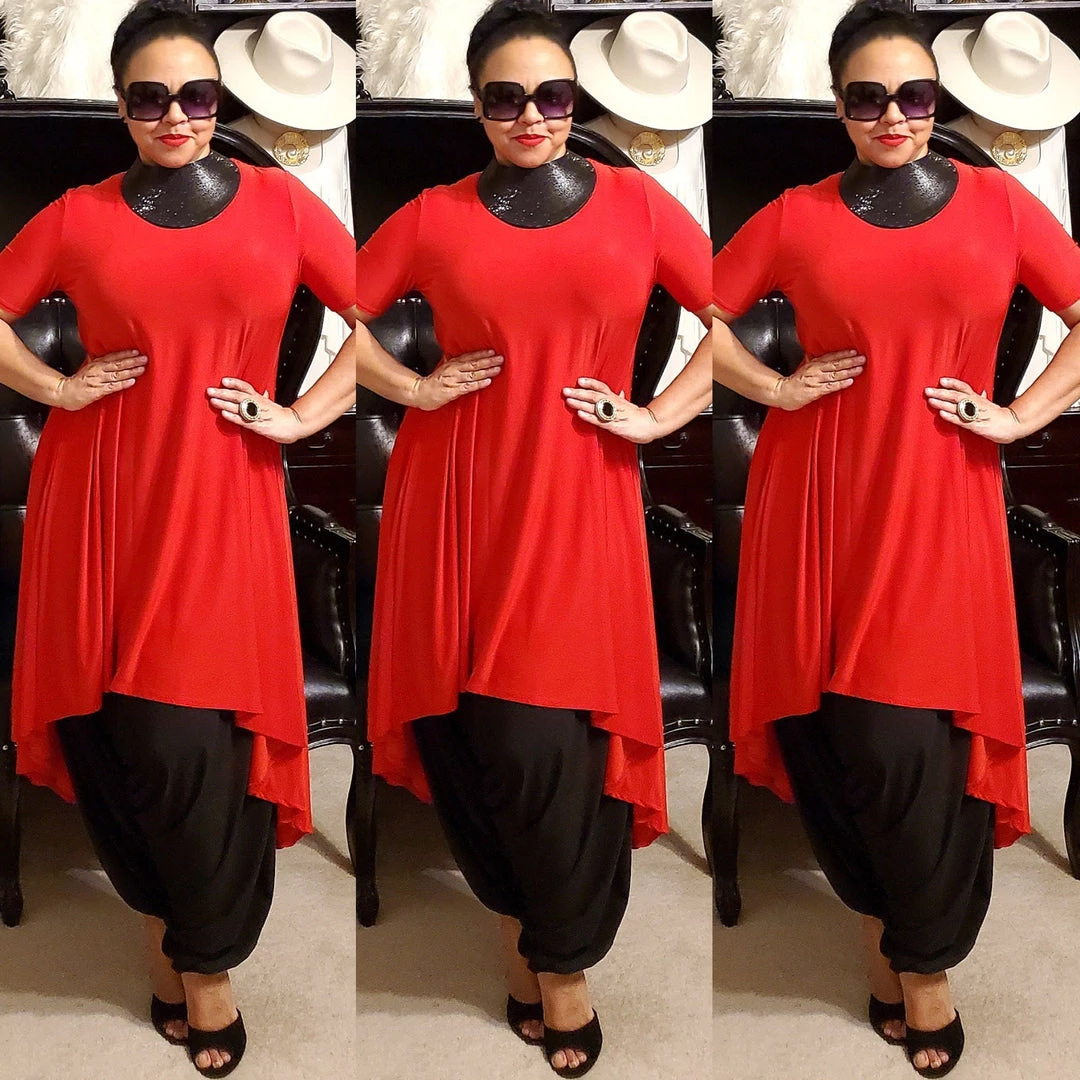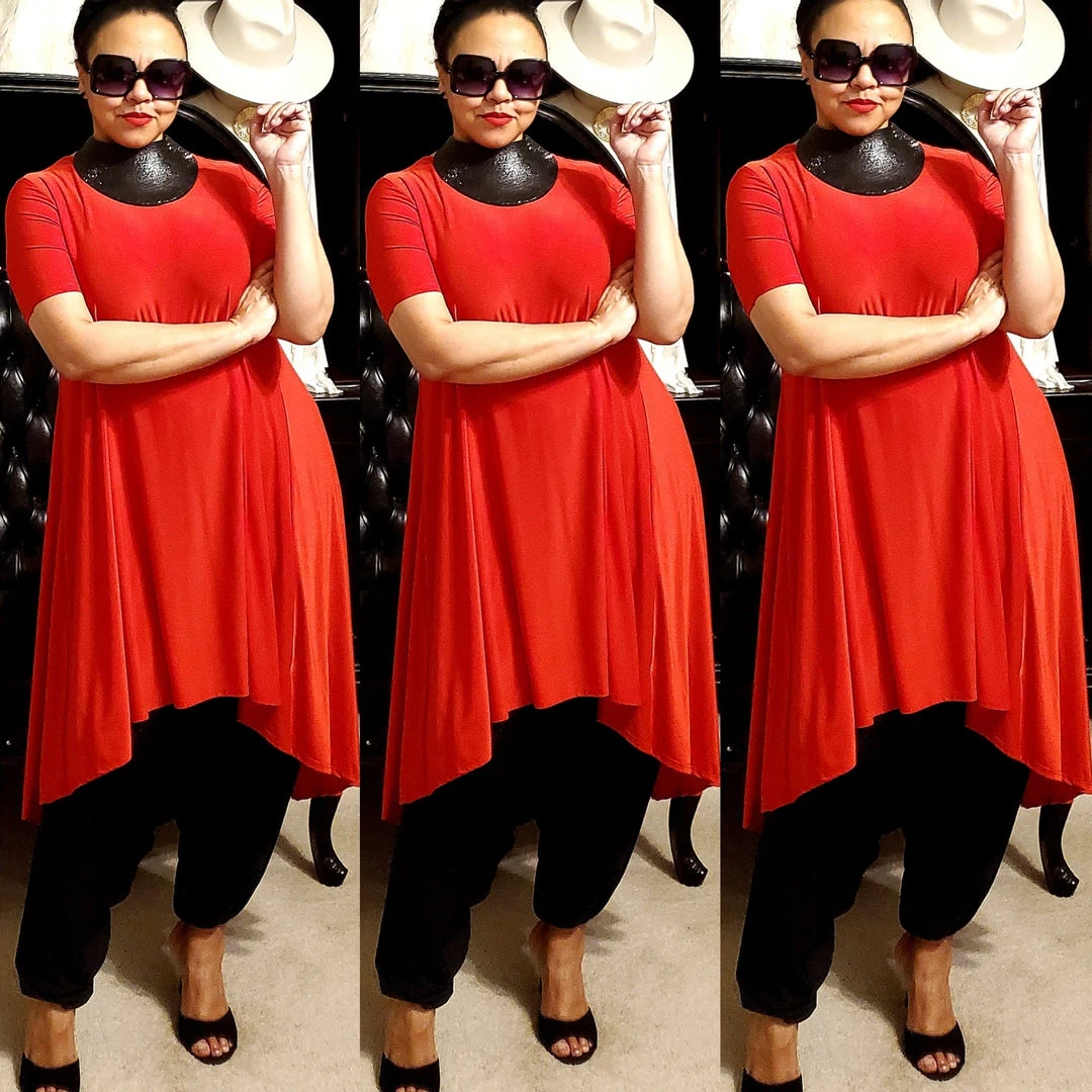 Wear as a dress or as a high low top. We styled this a few different ways. Looks great with thigh high boots or with faux leather leggings or simple high heel shoes or sandals. Wear it loose fitting or add a belt to cinch in your waistline. We are showing our quick accessory kimono style wrap belt with it. We are also showing it with a variety of different lengths necklaces. Model is wearing size 12-14 which equals a large. Models bust is 40D, waist is 34 inches and hips measures 43 inches and model is 5 feet 6 inches tall. This red high low slinky jersey knit dress is the perfect addition to any wardrobe as it looks nice, and fits great, to be comfortable for any reason you wear it. Fabric is soft stretchy jersey knit that moves and flows. Fits true to size. Shown with tulle skirt or harem pants or faux leather leggings. Pants and skirts sold separately. Ships from Houston, Texas by Social Butterfly Collection.