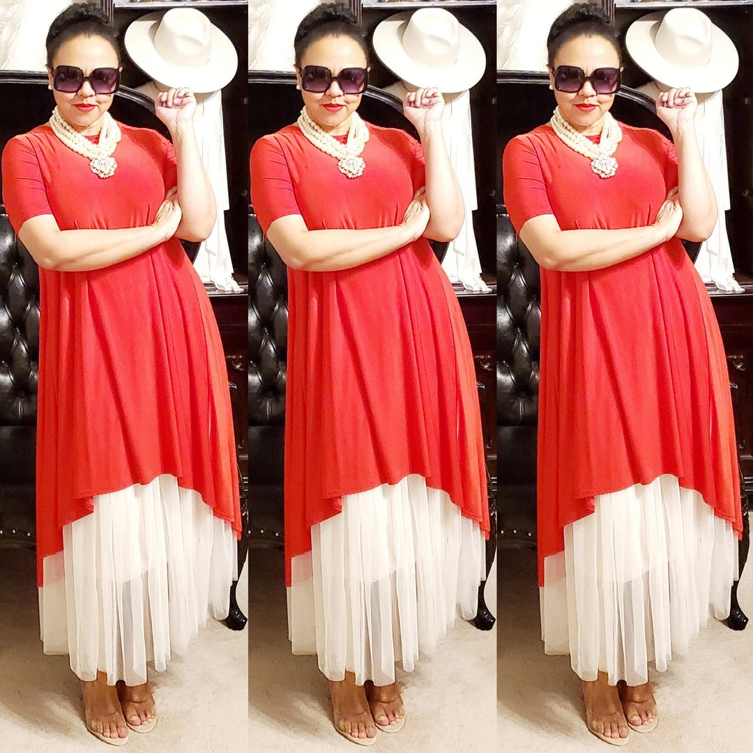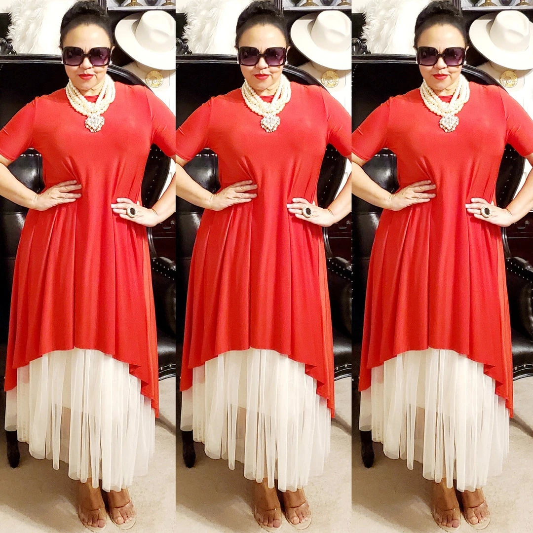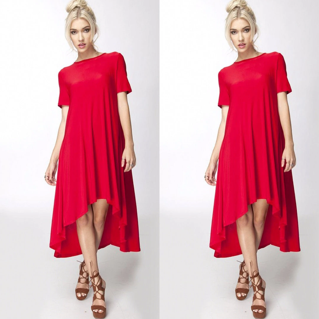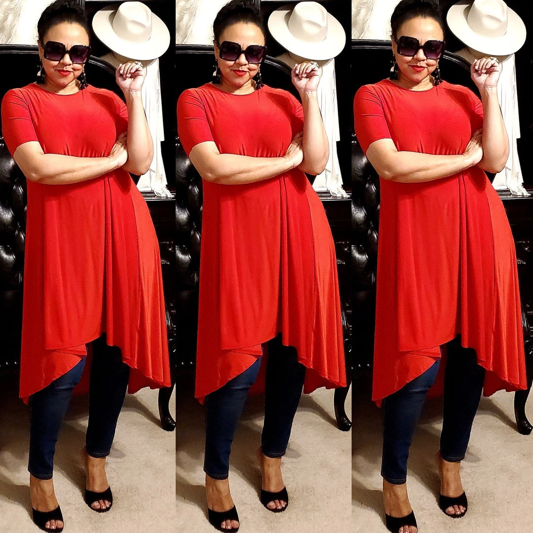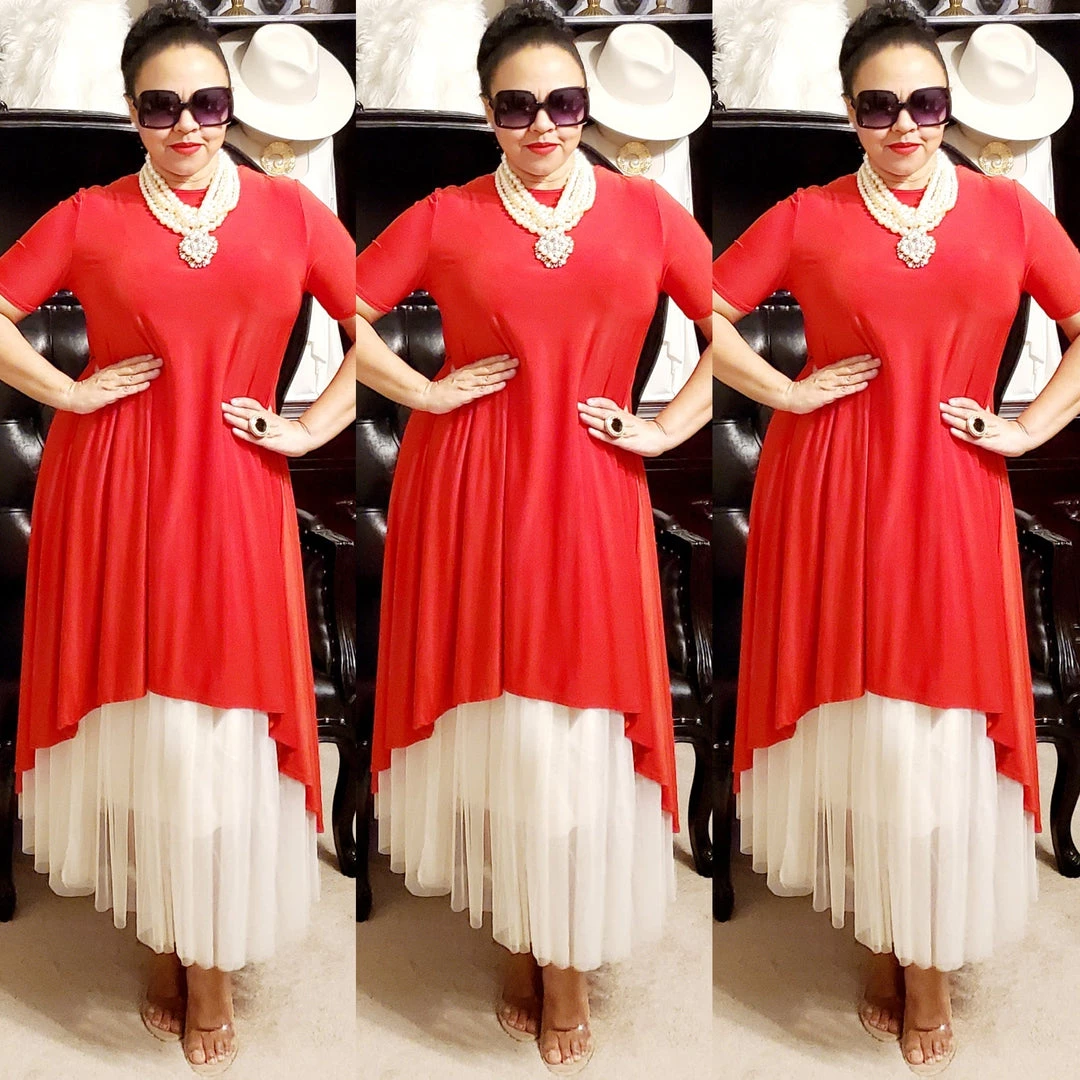 Wear as a dress or as a high low top. We styled this a few different ways. Looks great with thigh high boots or with faux leather leggings or simple high heel shoes or sandals. Wear it loose fitting or add a belt to cinch in your waistline. We are showing our quick accessory kimono style wrap belt with it. We are also showing it with a variety of different lengths necklaces. Model is wearing size 12-14 which equals a large. Models bust is 40D, waist is 34 inches and hips measures 43 inches and model is 5 feet 6 inches tall. This red high low slinky jersey knit dress is the perfect addition to any wardrobe as it looks nice, and fits great, to be comfortable for any reason you wear it. Fabric is soft stretchy jersey knit that moves and flows. Fits true to size. Shown with tulle skirt or harem pants or faux leather leggings. Pants and skirts sold separately. Ships from Houston, Texas by Social Butterfly Collection.