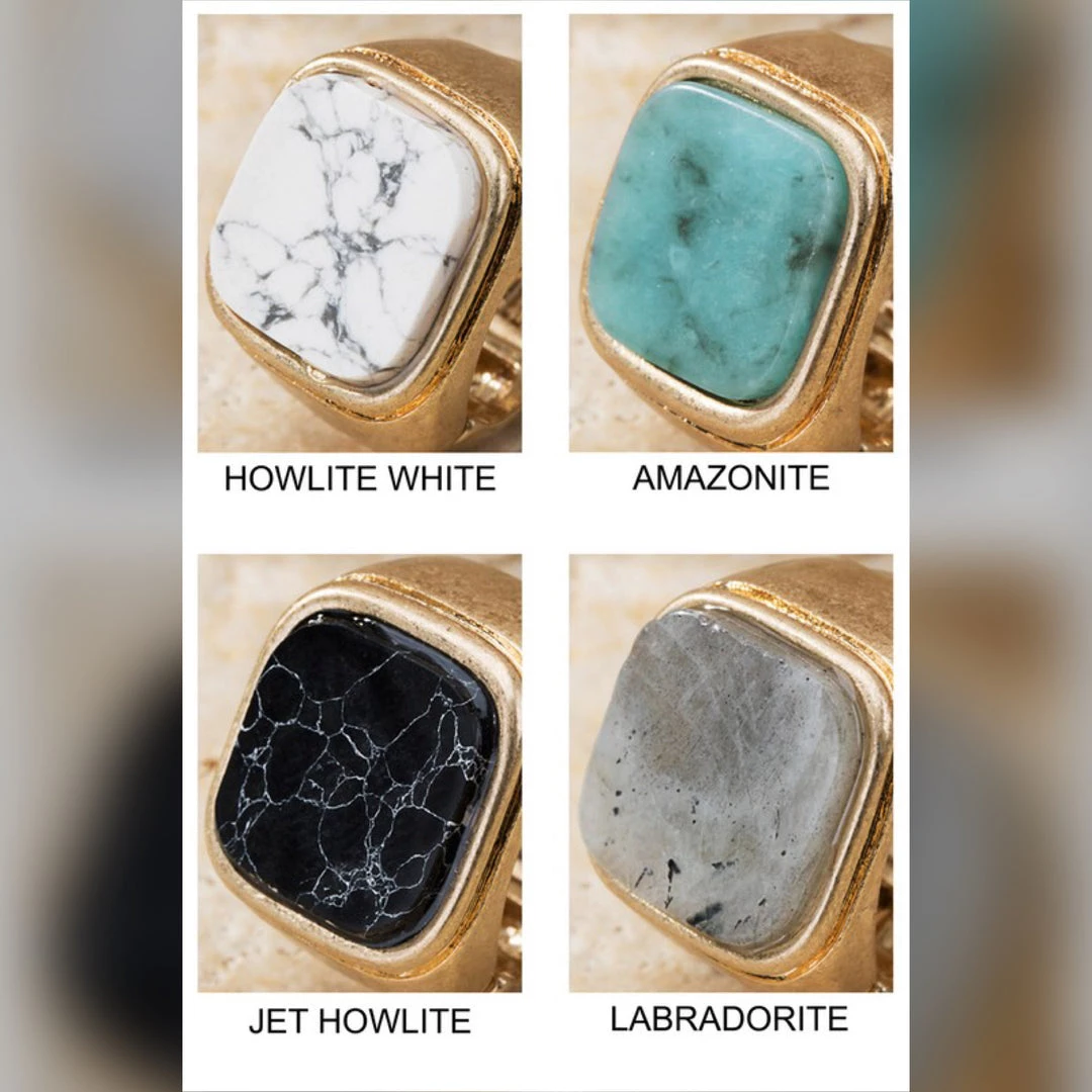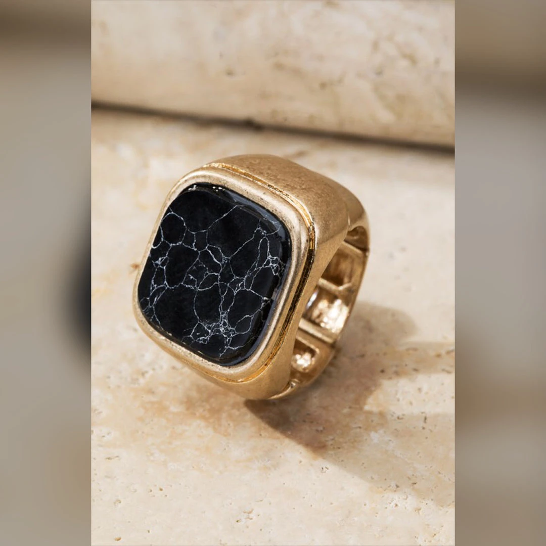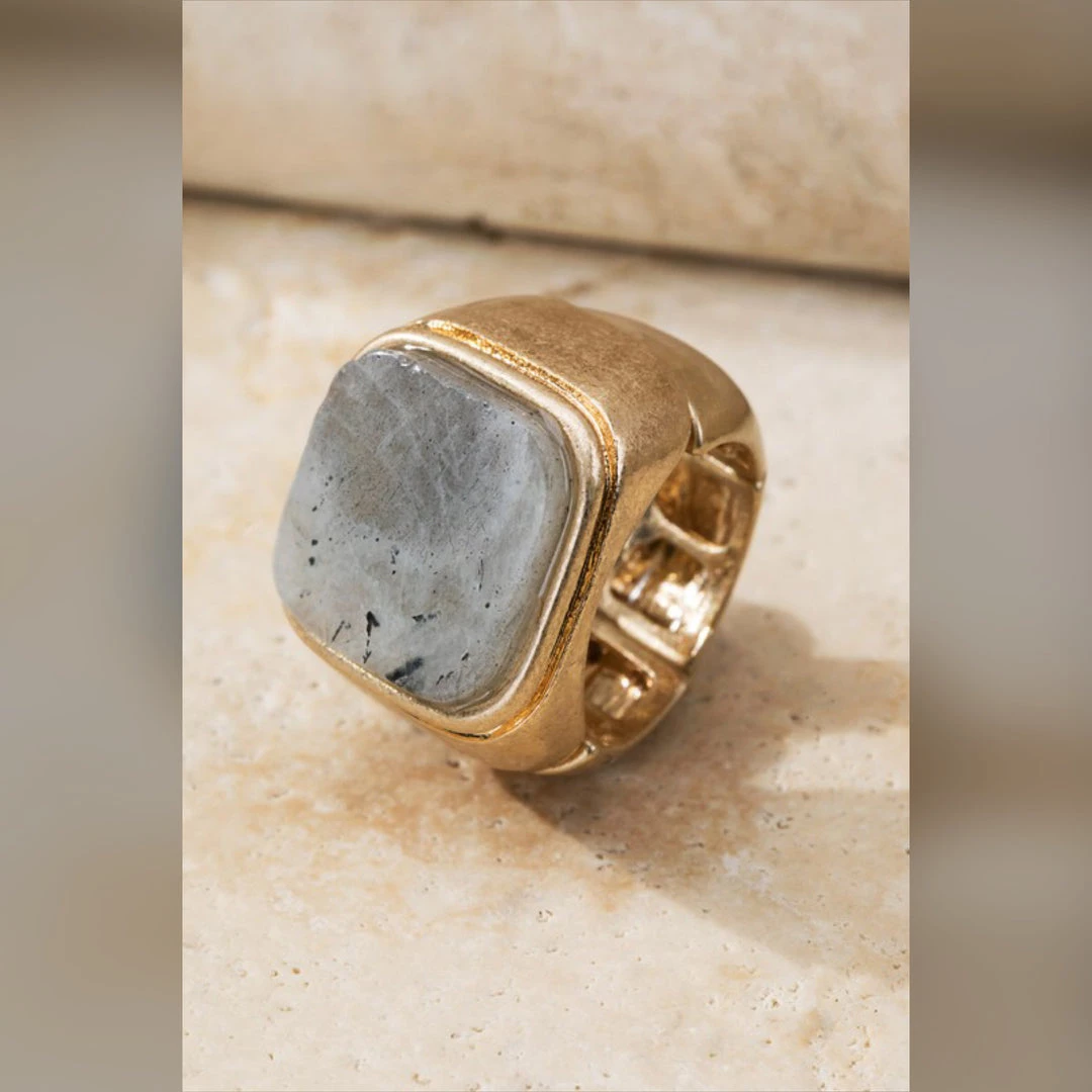 A ring is the perfect accessory to top off any outfit and make a bold statement. Square natural stone ring with stretchy band to fit all sizes. Band of the ring will stretch to fit. Ships from Houston, Texas by Social Butterfly Collection.