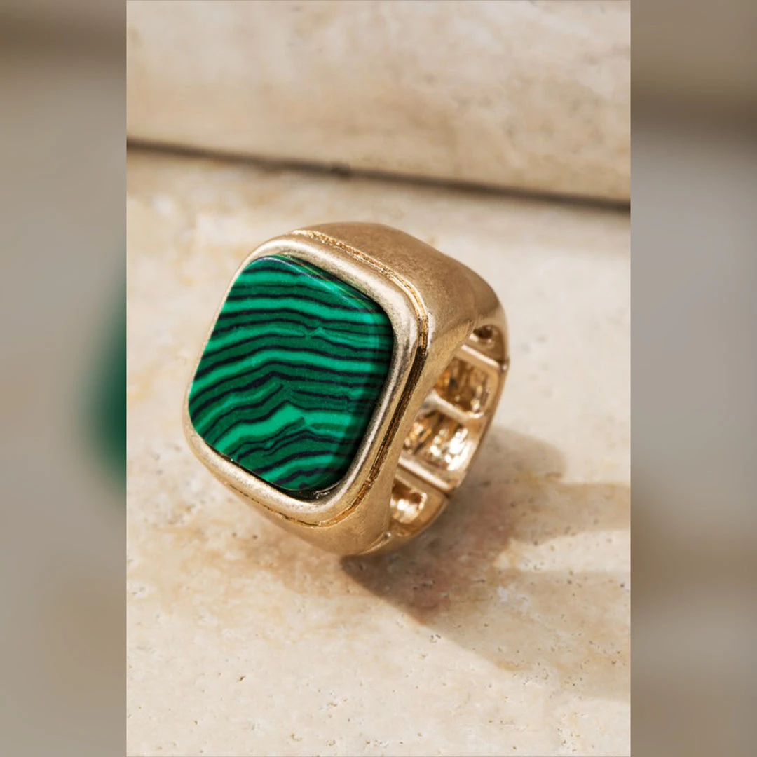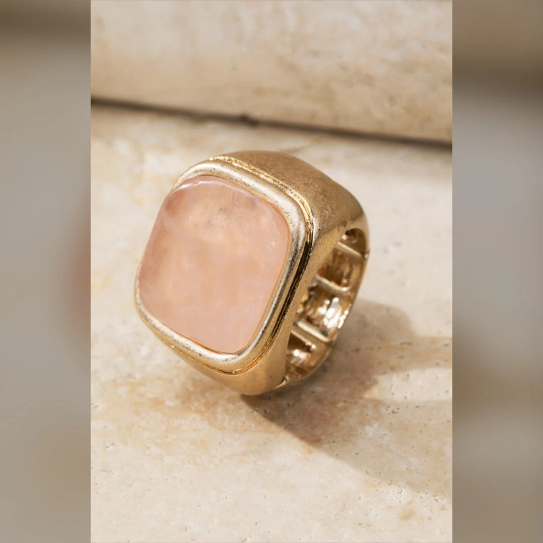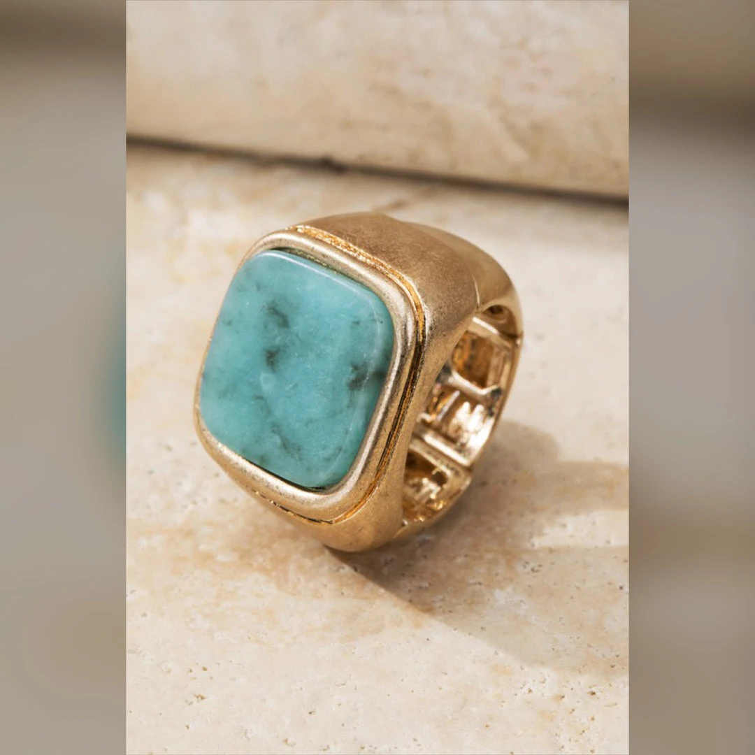 A ring is the perfect accessory to top off any outfit and make a bold statement. Square natural stone ring with stretchy band to fit all sizes. Band of the ring will stretch to fit. Ships from Houston, Texas by Social Butterfly Collection.