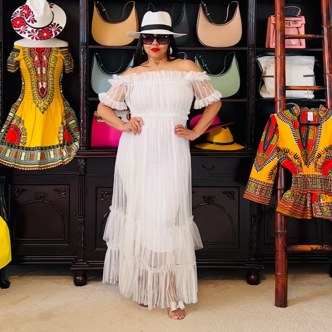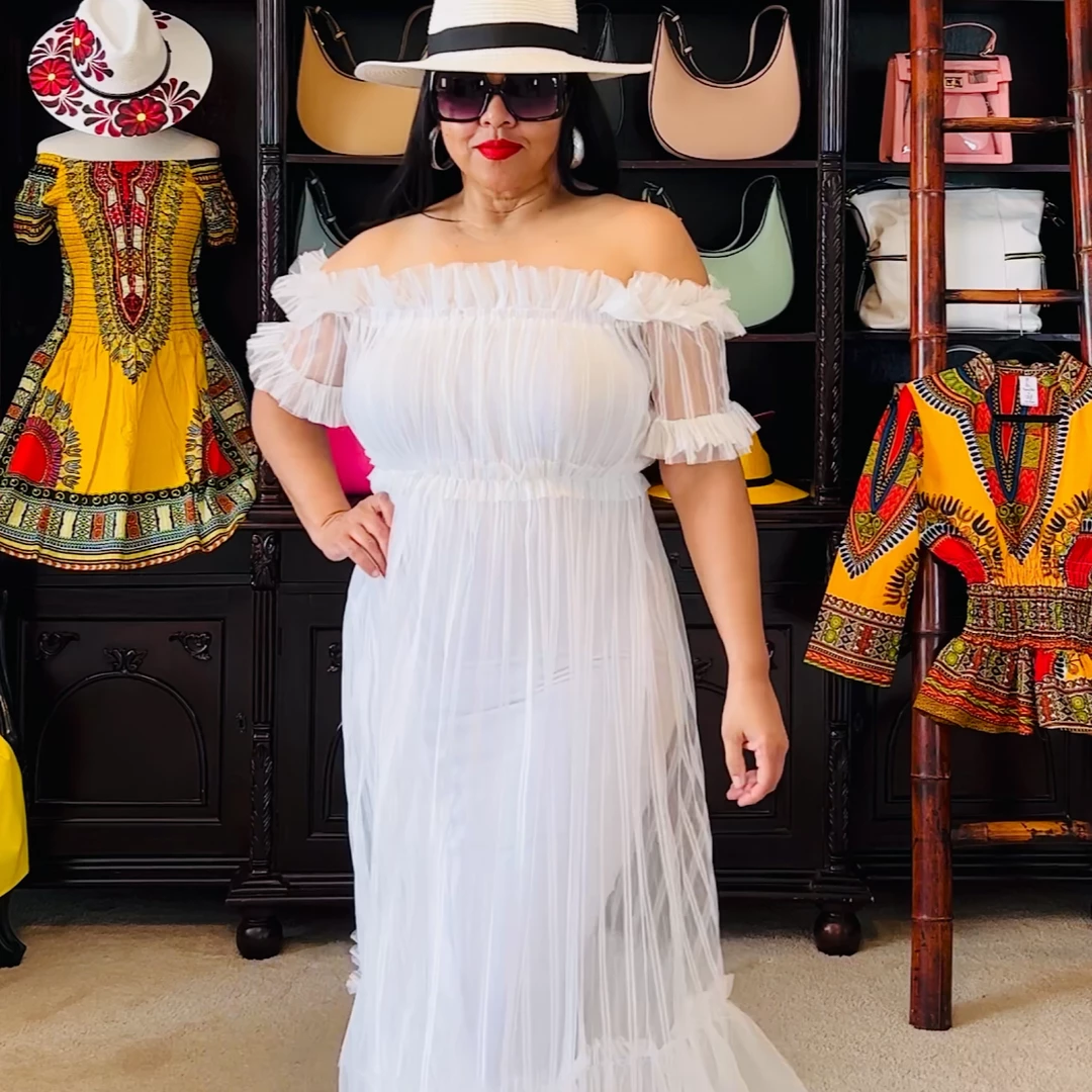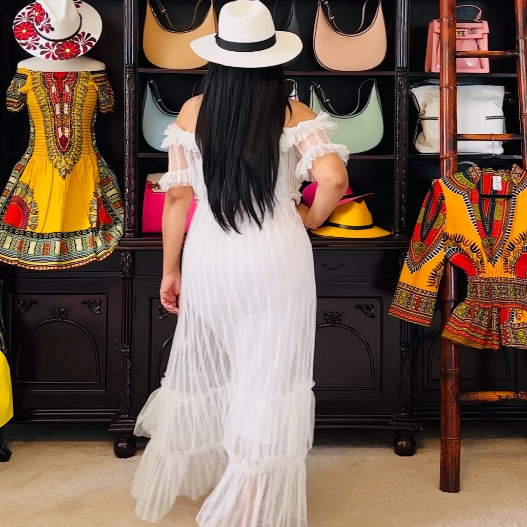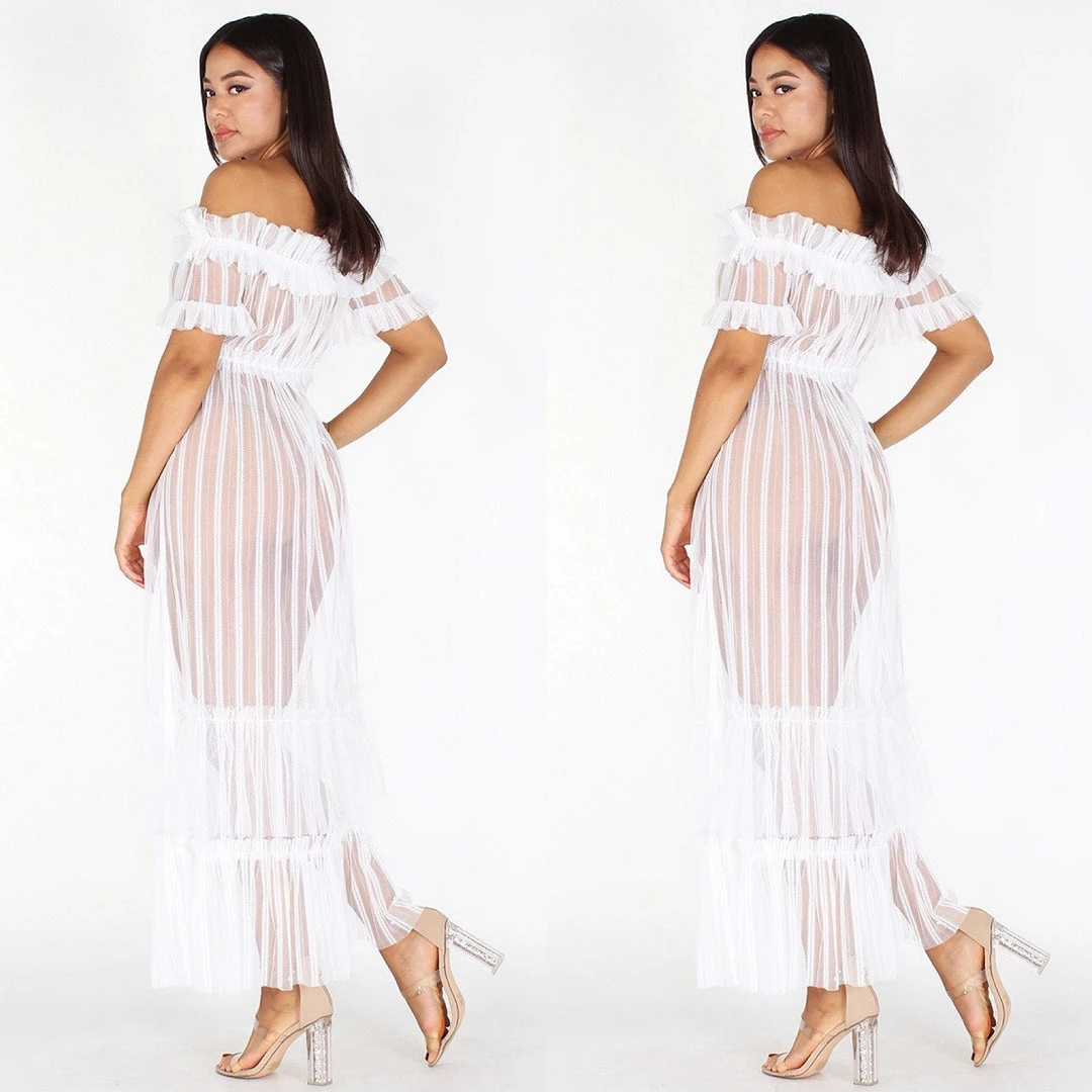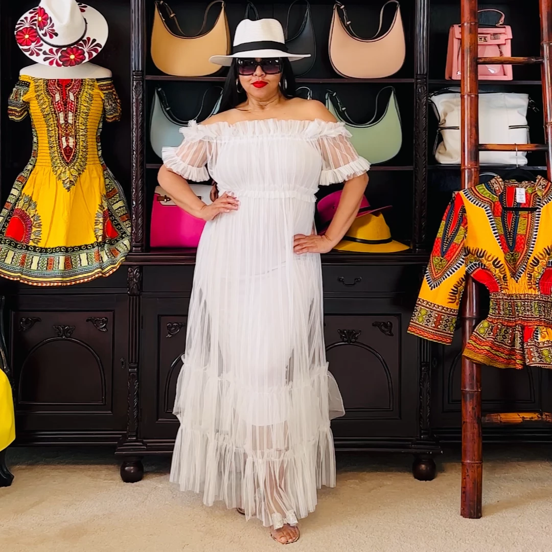 DRESS IS COMPLETELY SHEER SEE THROUGH. MODEL HAS ON A TUBE DRESS UNDERNEATH. TUBE DRESS SOLD SEPARATELY. Lovely for a glamorous vacation outfit or fun filled all white party. This sheer white dress looks and feels light and airy. The dress is a long maxi style and is worn off the shoulders. Both the shoulders and the waist line have great elastic for plenty of stretch and comfort. The dress is designed to be completely see through. We have paired it with our white tube dress underneath to serve as a fitted slip. The dress works well as a swimsuit cover up and works well while on beach or cruise vacations. Hat sold separately. Ships from Houston, Texas by Social Butterfly Collection.