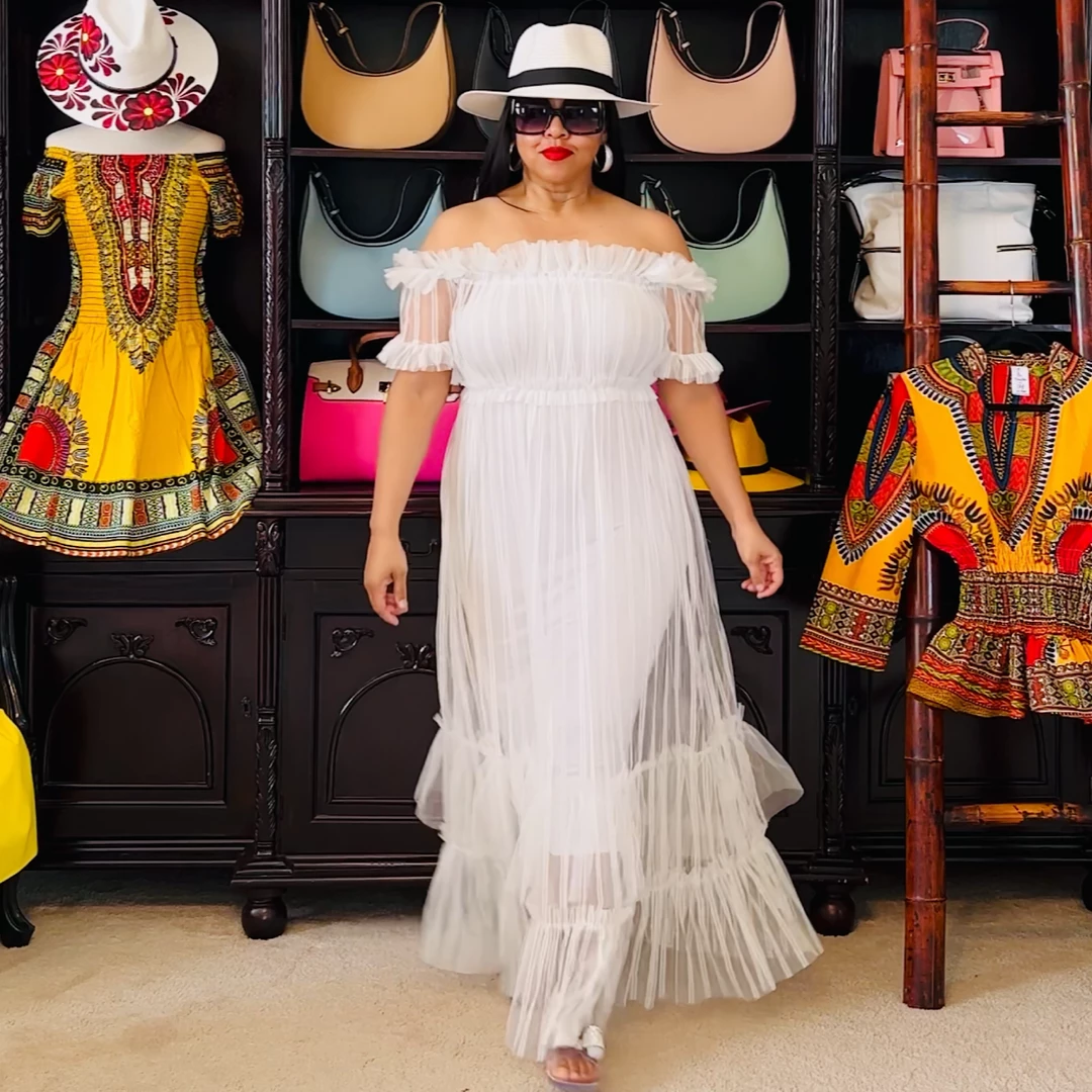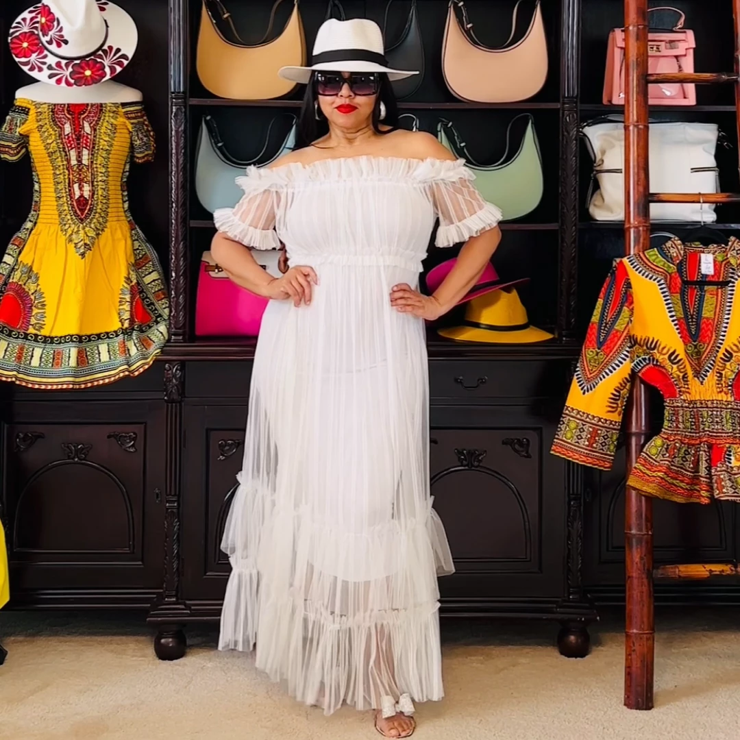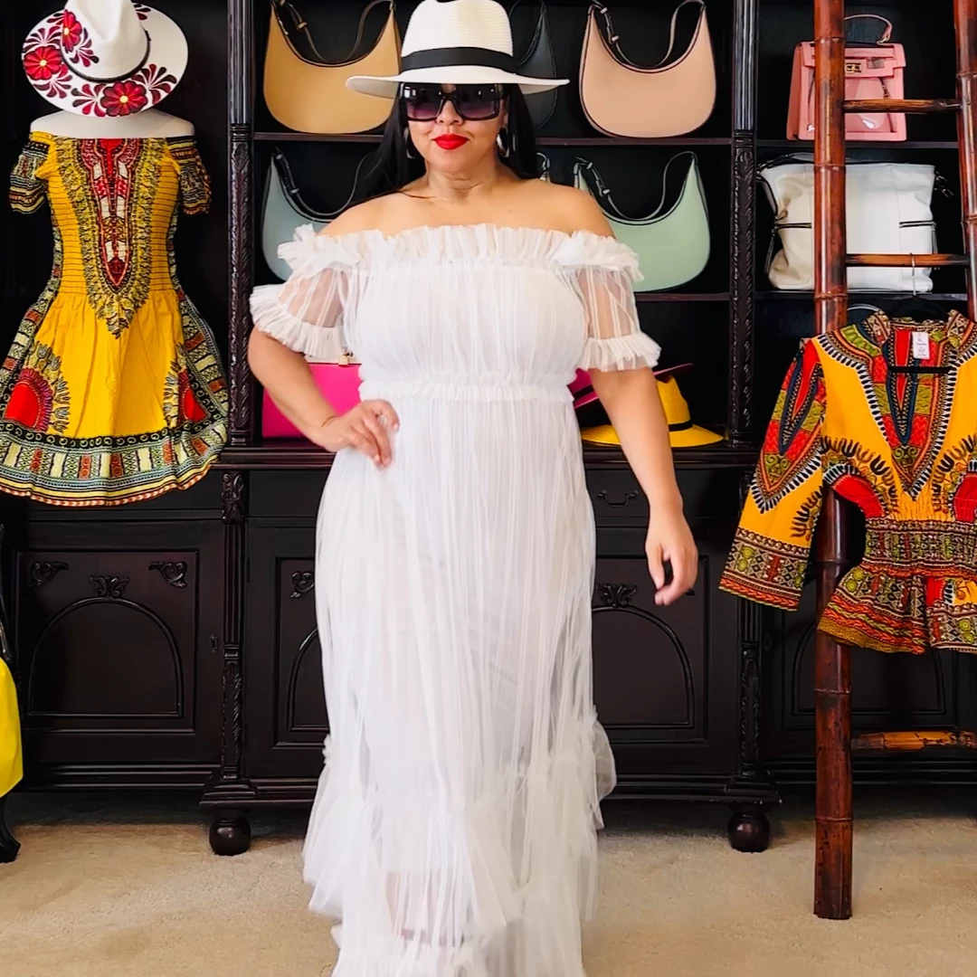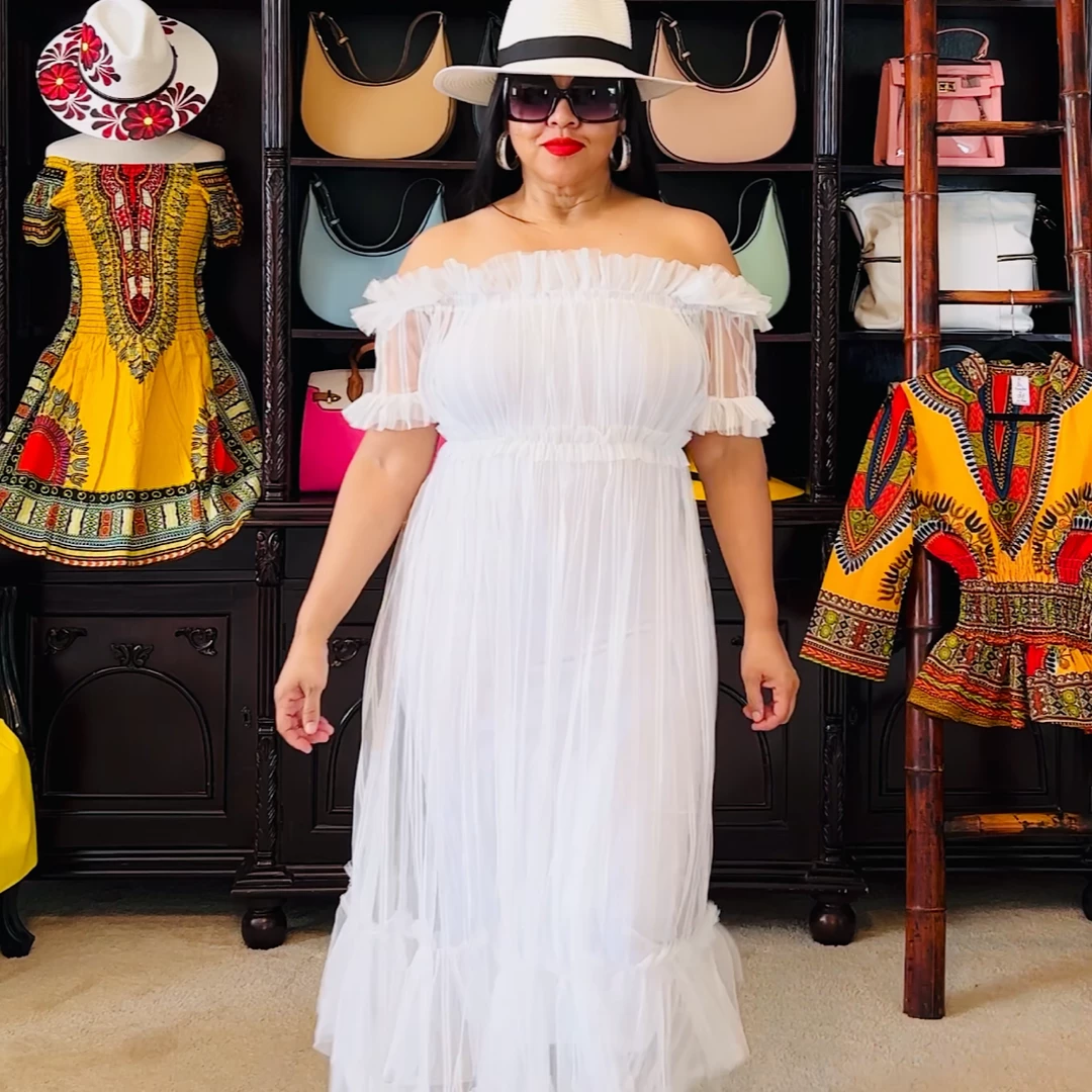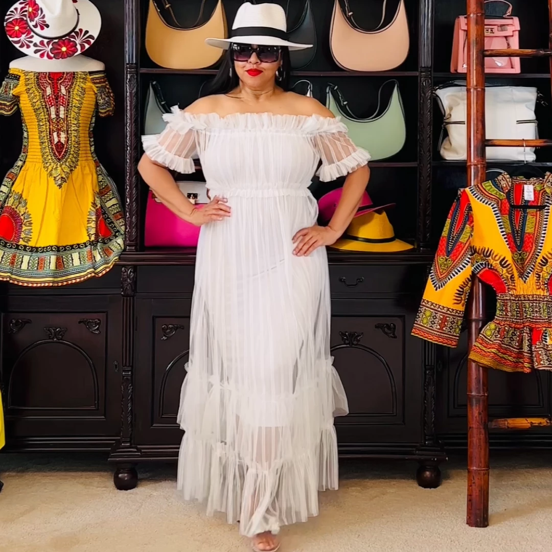 DRESS IS COMPLETELY SHEER SEE THROUGH. MODEL HAS ON A TUBE DRESS UNDERNEATH. TUBE DRESS SOLD SEPARATELY. Lovely for a glamorous vacation outfit or fun filled all white party. This sheer white dress looks and feels light and airy. The dress is a long maxi style and is worn off the shoulders. Both the shoulders and the waist line have great elastic for plenty of stretch and comfort. The dress is designed to be completely see through. We have paired it with our white tube dress underneath to serve as a fitted slip. The dress works well as a swimsuit cover up and works well while on beach or cruise vacations. Hat sold separately. Ships from Houston, Texas by Social Butterfly Collection.