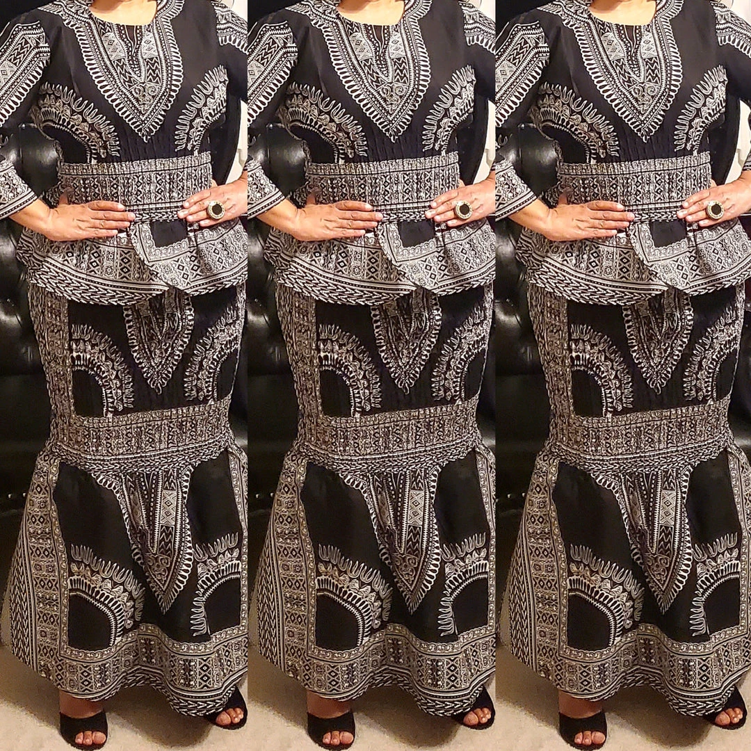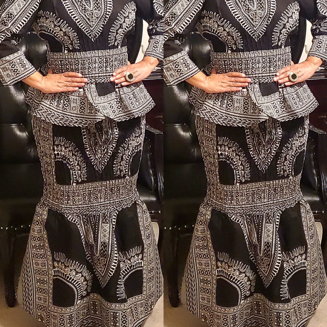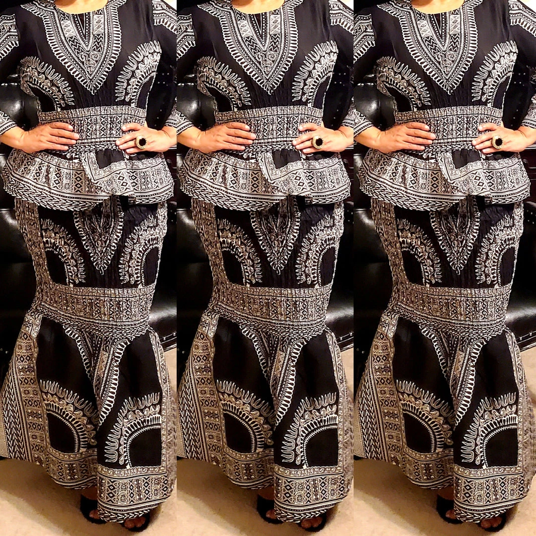 Celebrate your lifestyle of social and cultural events with this stylish dashiki print two piece set. Waistband of the top has amazing elastic stretch that gives room for comfort yet a form fit. Bold vibrant prints and colors. Wears beautifully and would be great for any special occasion from church to an evening affair. 100% cotton. Skirt is form fitted and has tons of elastic for really great stretch to fit you perfectly. Skirts waistband has elastic as well. Model is 5 feet 6 inches and she is wearing size large 12-14. Ships from Houston, Texas By Social Butterfly Collection.