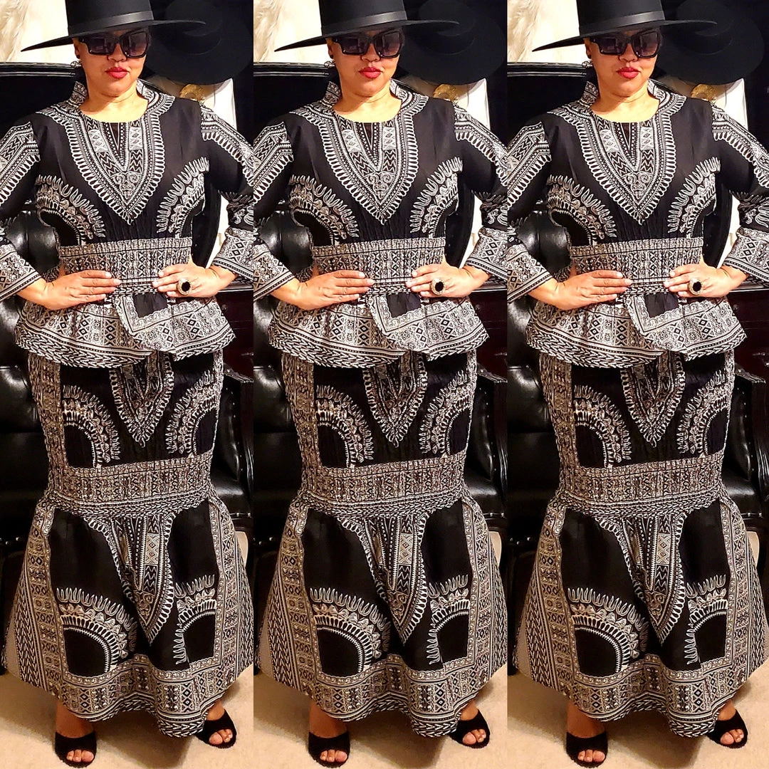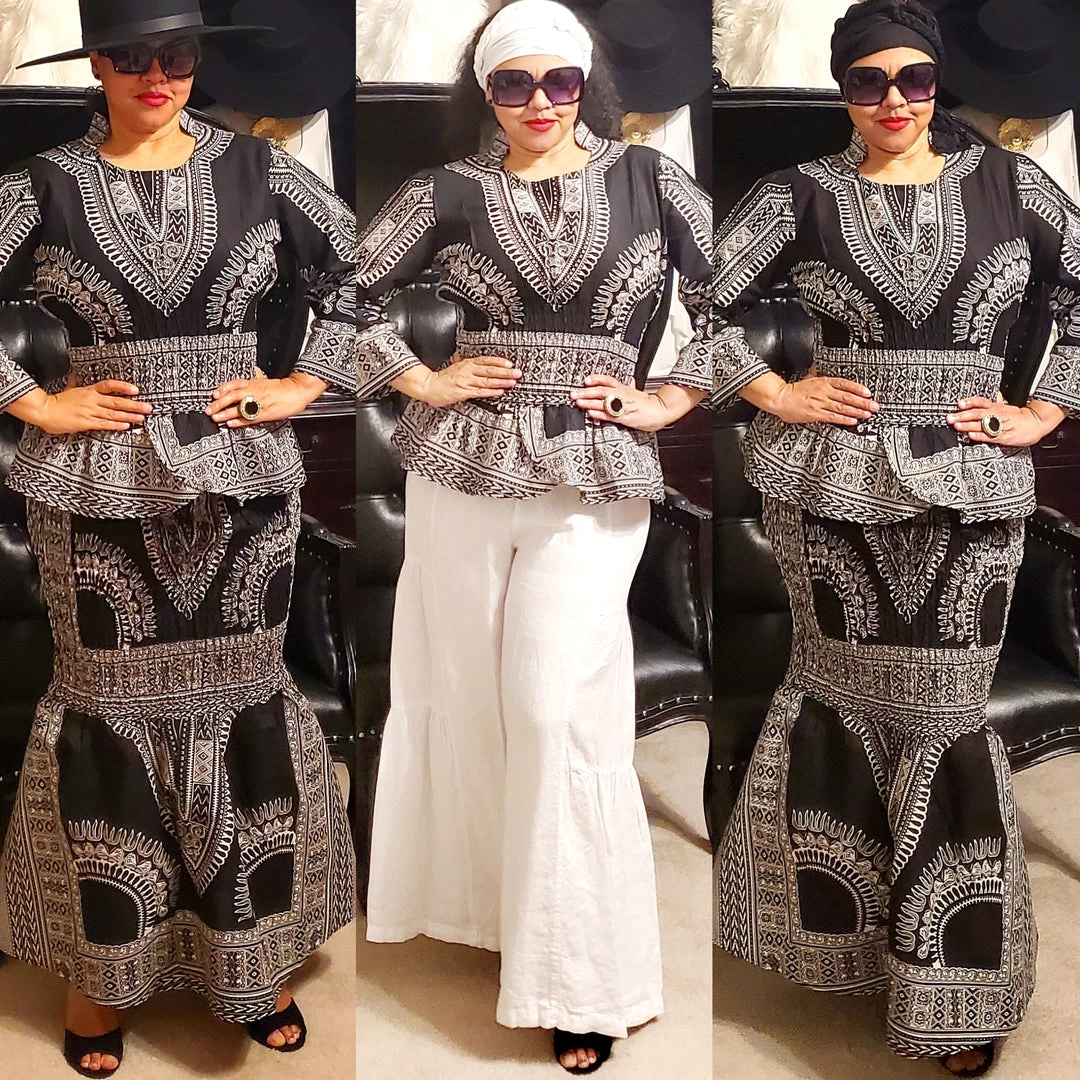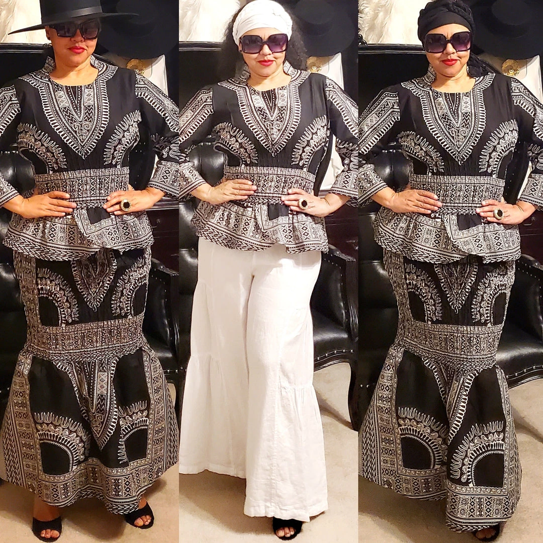 Celebrate your lifestyle of social and cultural events with this stylish dashiki print two piece set. Waistband of the top has amazing elastic stretch that gives room for comfort yet a form fit. Bold vibrant prints and colors. Wears beautifully and would be great for any special occasion from church to an evening affair. 100% cotton. Skirt is form fitted and has tons of elastic for really great stretch to fit you perfectly. Skirts waistband has elastic as well. Model is 5 feet 6 inches and she is wearing size large 12-14. Ships from Houston, Texas By Social Butterfly Collection.