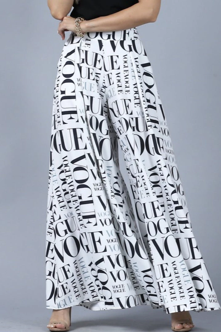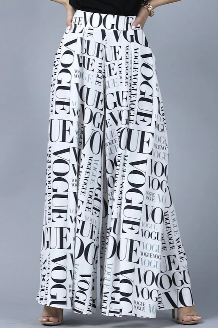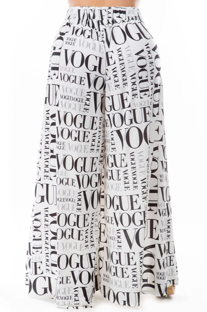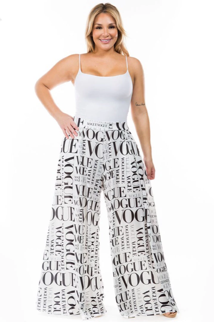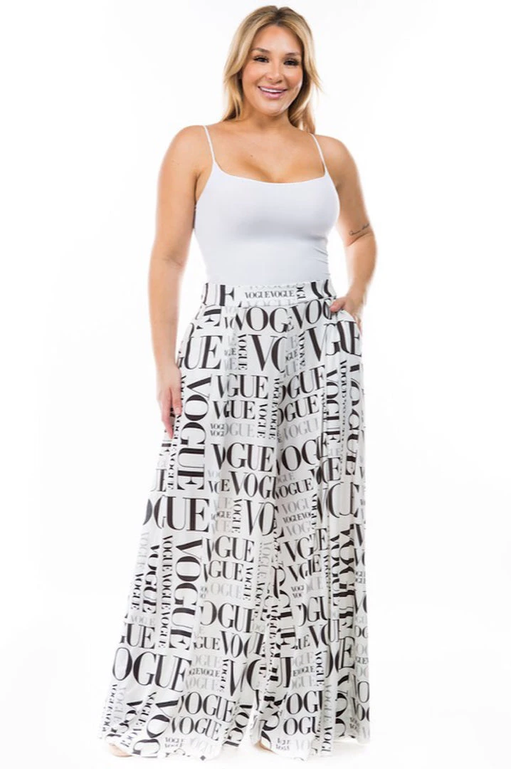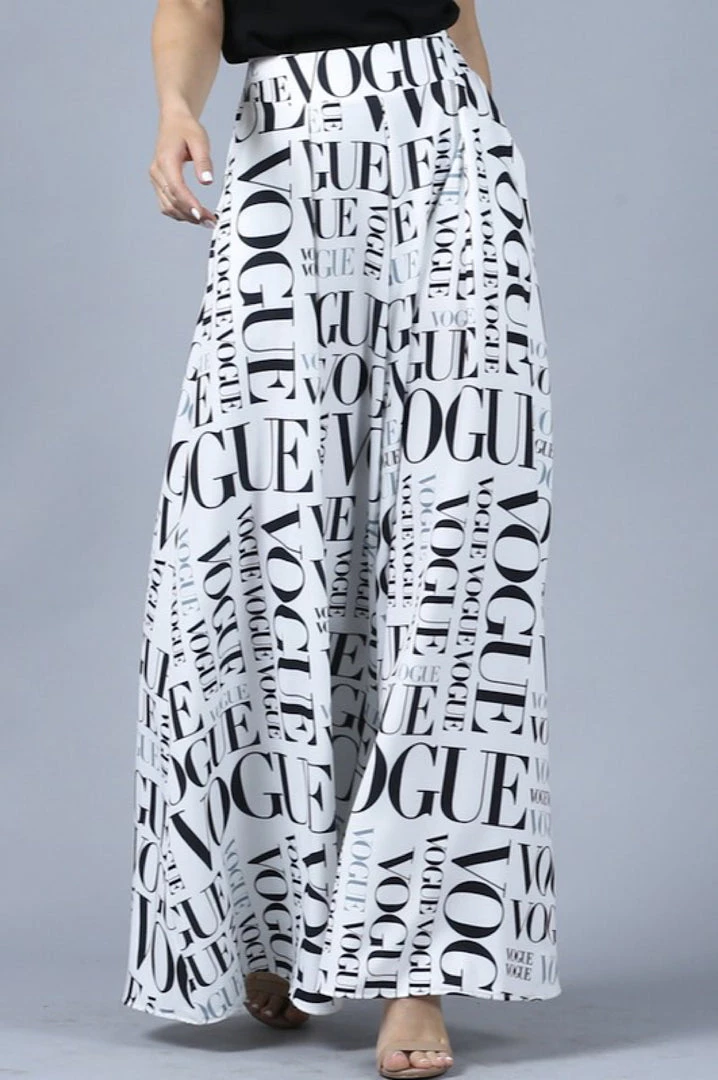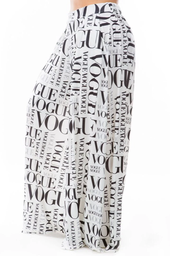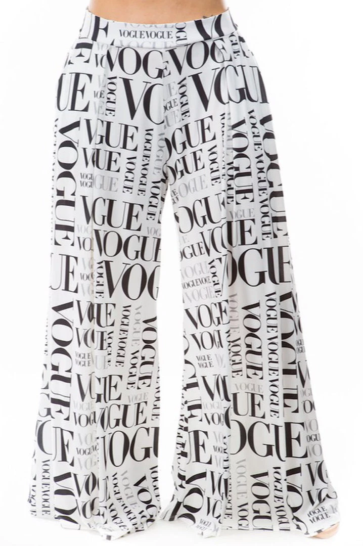 The modern day wide leg palazzo pants in a black and red Vogue print. These pants are super long at 45 inches long and and inseam of 33 inches. The model is 5 feet 8 inches tall and she has on size 14/16 XL. Wide leg and elastic very stretchy waistband. The pants are ideal if you are really tall but most will have to have them hemmed or wear really high heels. Polyester and spandex blend with plenty of stretch. The waistband has elastic and will stretch to fit you comfortably. The pants have side pockets. Beautiful feel and look to this fabric. Made in the USA. Ships from Houston, Texas by Social Butterfly Collection.