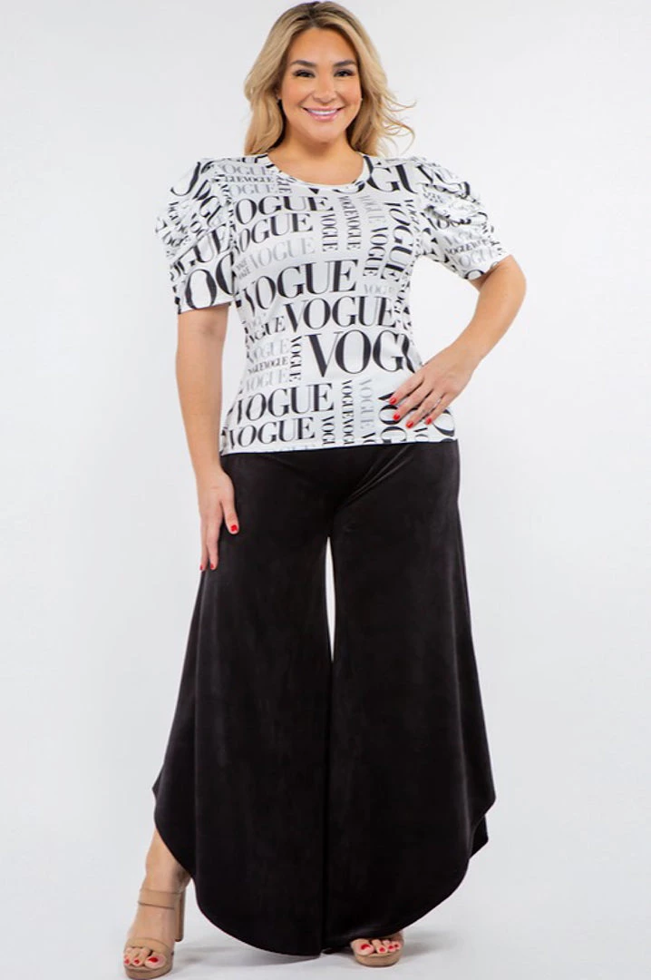 Black White Vogue print top only. Tops and pants sold separately. Your closet should always have pieces you can wear with anything and look great; and there is no better example of that than this fitted puffy sleeve top. Top is very fitted in the bodice and the sleeves are slightly puffed with ruching detailing. We recommend going up one size if you are top heavy and carry more weight in your bust and stomach and if you don’t like too fitted. This top is designed to be fitted. Shirt is short waist so it looks best with high waisted pants or skirts. Fabric has a lot of spandex and stretch. Material is polyester and spandex blend and feels like a cotton tee with stretch. Model has on size xlarge with her bust measurements at 42D and waist measurements at 38 inches. Xlarge is 14/16. Made in the USA. Model is 5 feet 8 inches tall. Ships from Houston, Texas by Social Butterfly Collection.