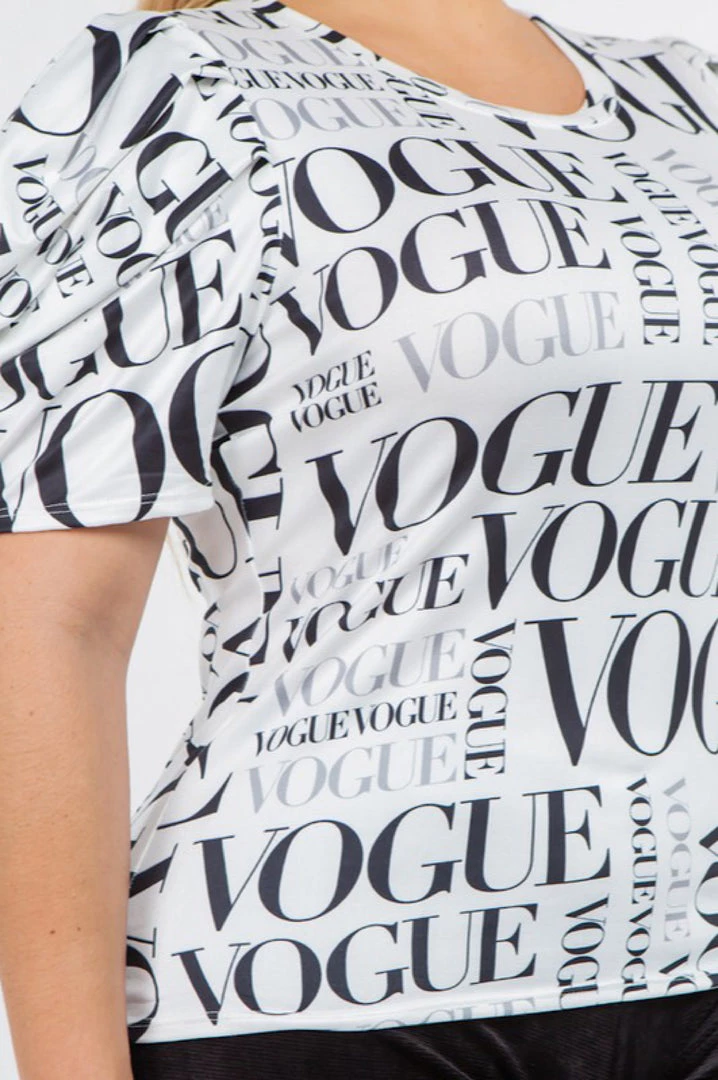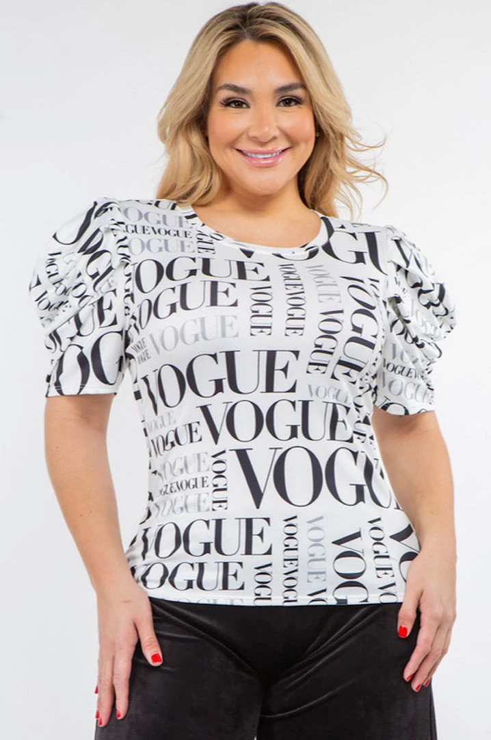 White Black Vogue Print Lightweight Fitted Puffy Sleeve Top