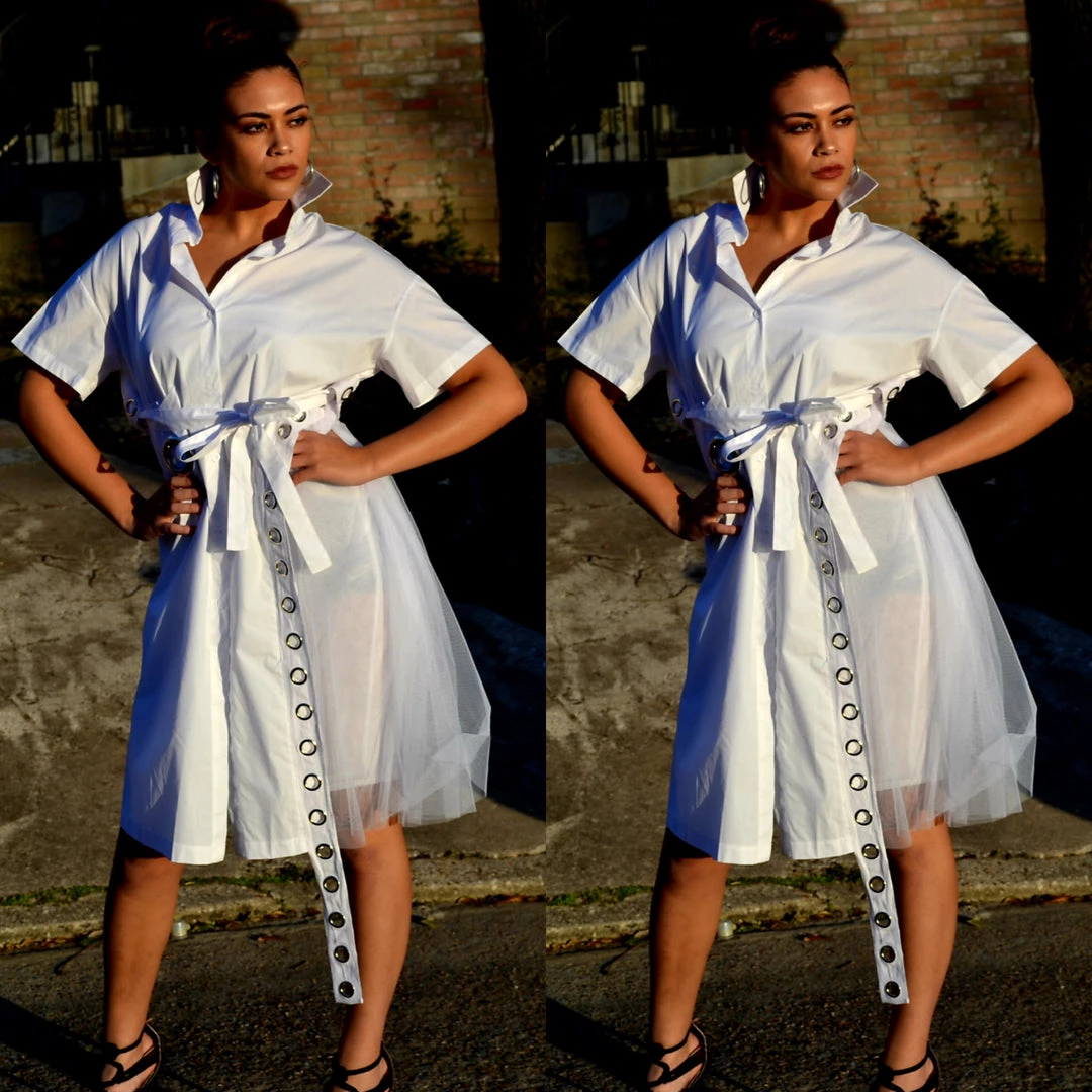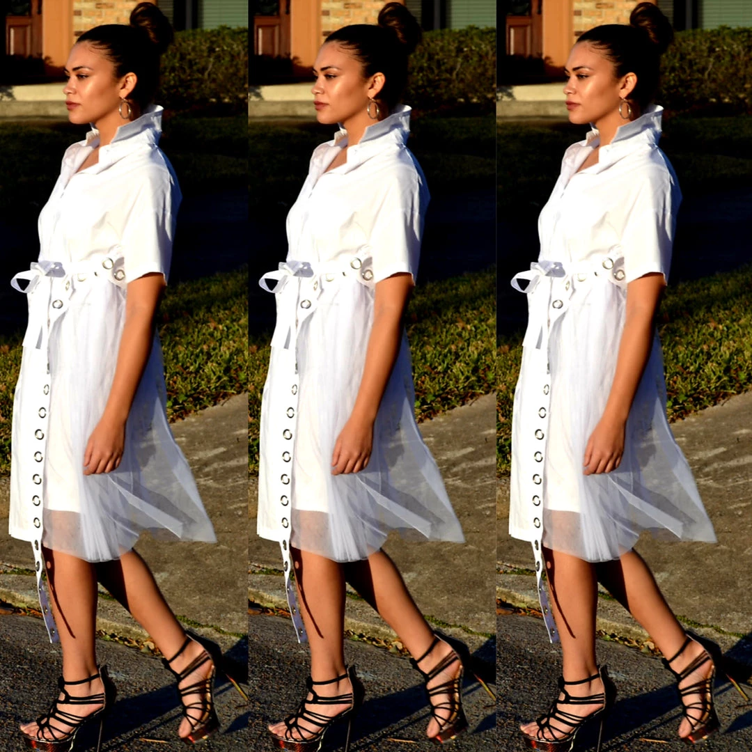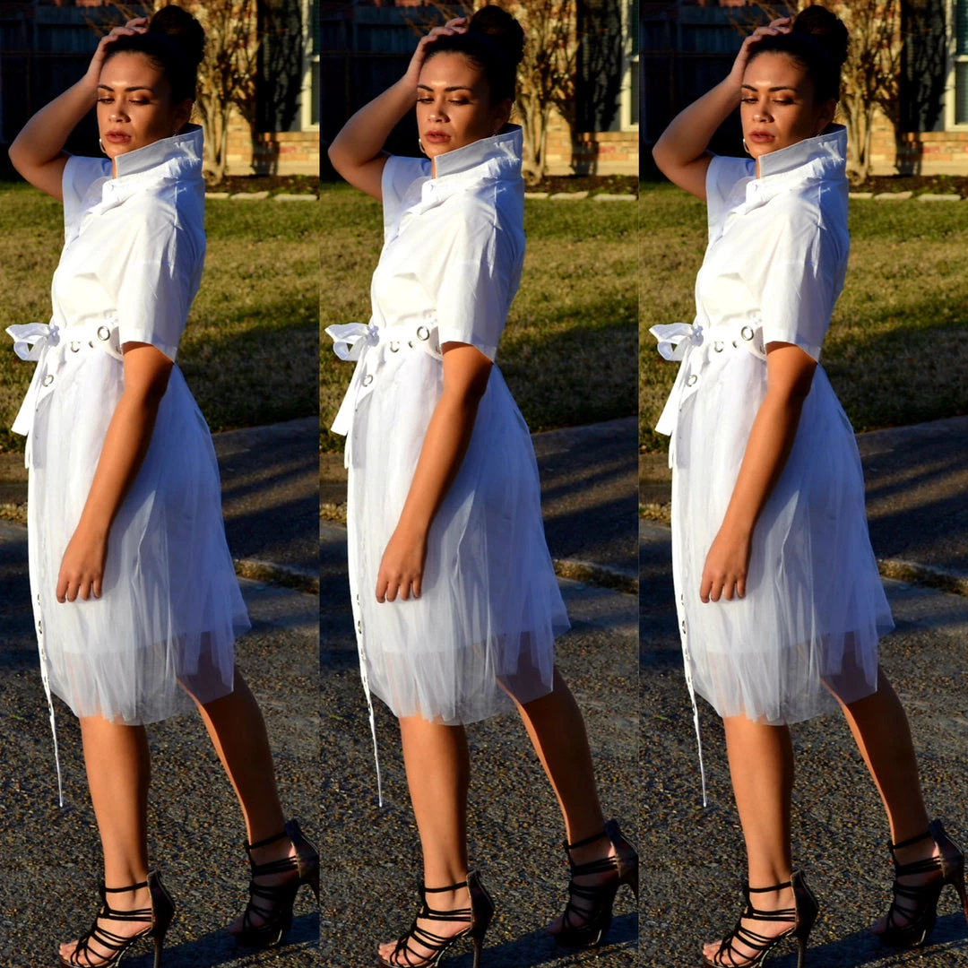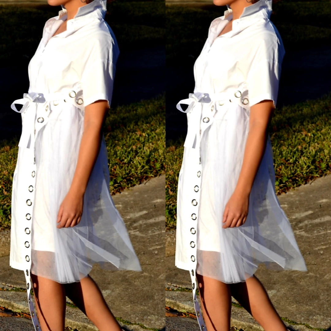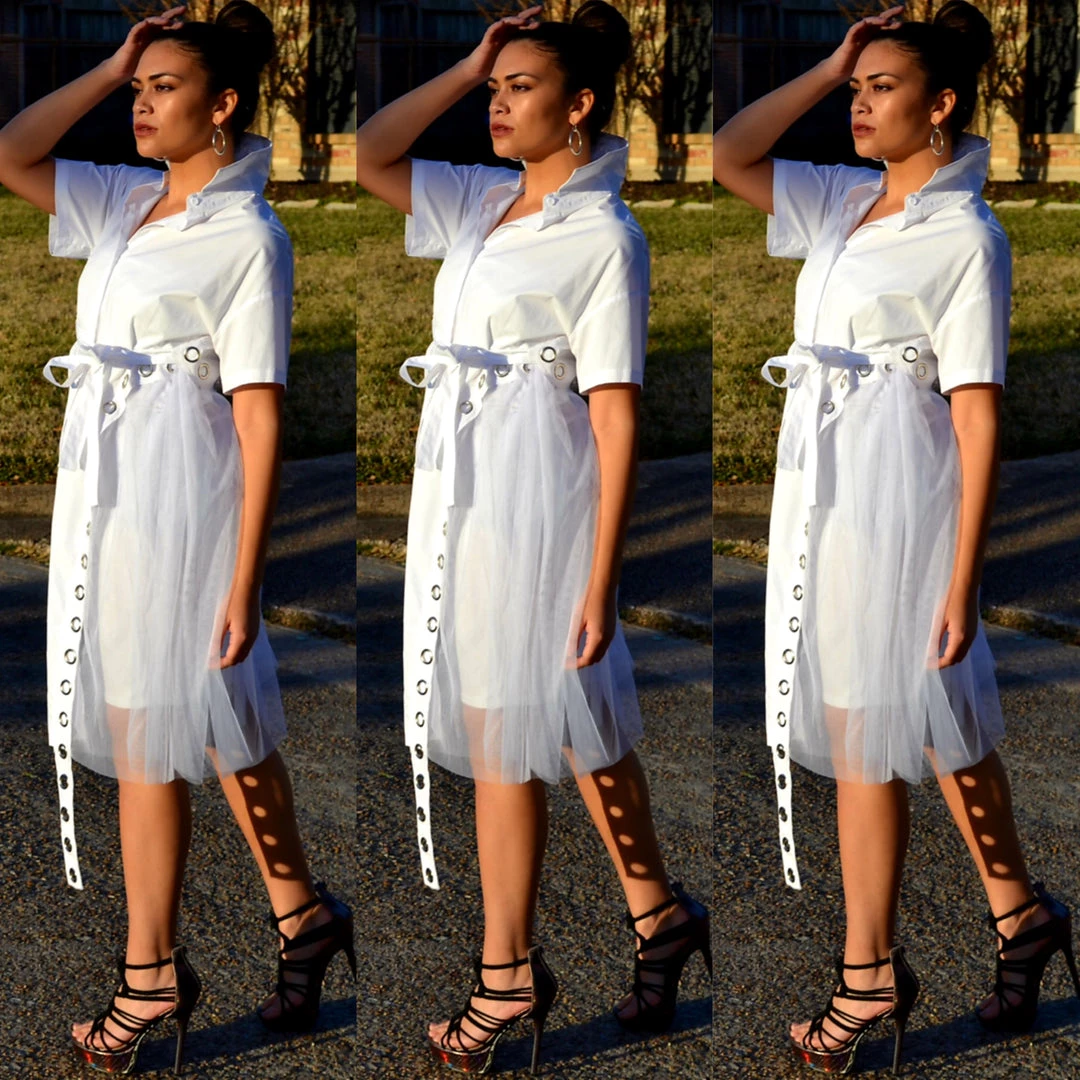 White top is shown with the shite straps tied around the waist as a belt. White is also shown with a white tube top dress worn underneath. Top is sheer see through tulle on the bottom. Need to dress up but you don’t want to fade into the crowd or be over dressed either? Then wearing this black button down style top will surely make you stand out and be seen while still being comfortable and chic. While everyone is checking you out, you’ll be cool, comfy and confident because this top brings out your true effortless beauty. Top is a soft cotton fabric perfect for those spring/summer days. Wear with heels or sandals and you will be good to go. Top is very generous in sizing and is designed to fit loose and full. Silver grommet details makes the look super edgy. Back of the top is sheer and front pocket detail. Ships from Houston, Texas by Social Butterfly Collection.