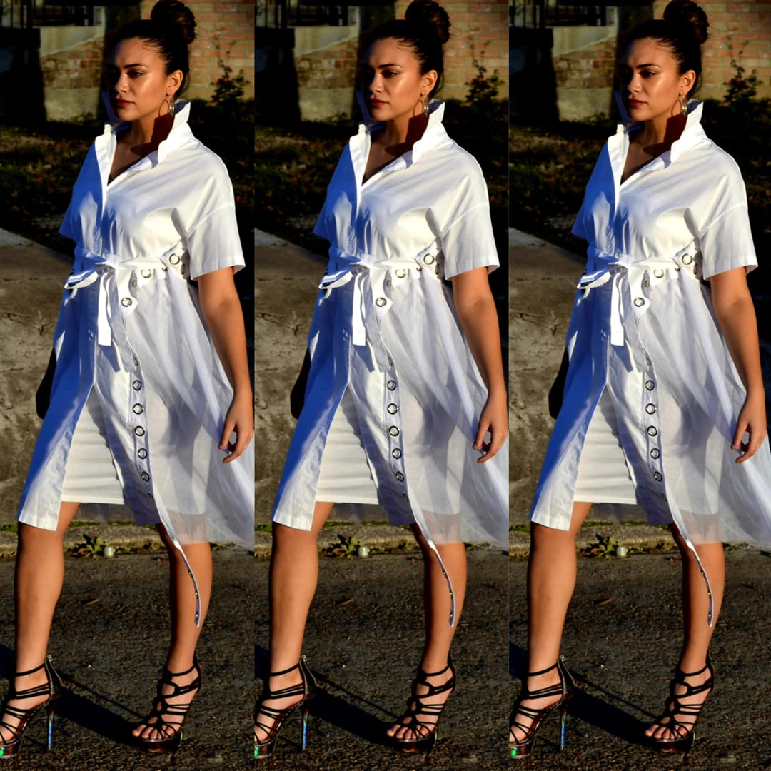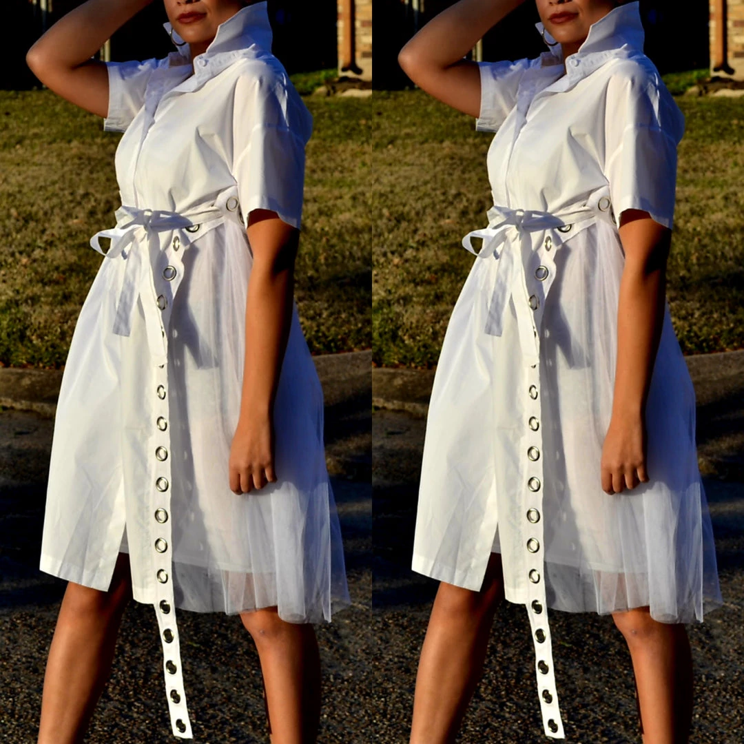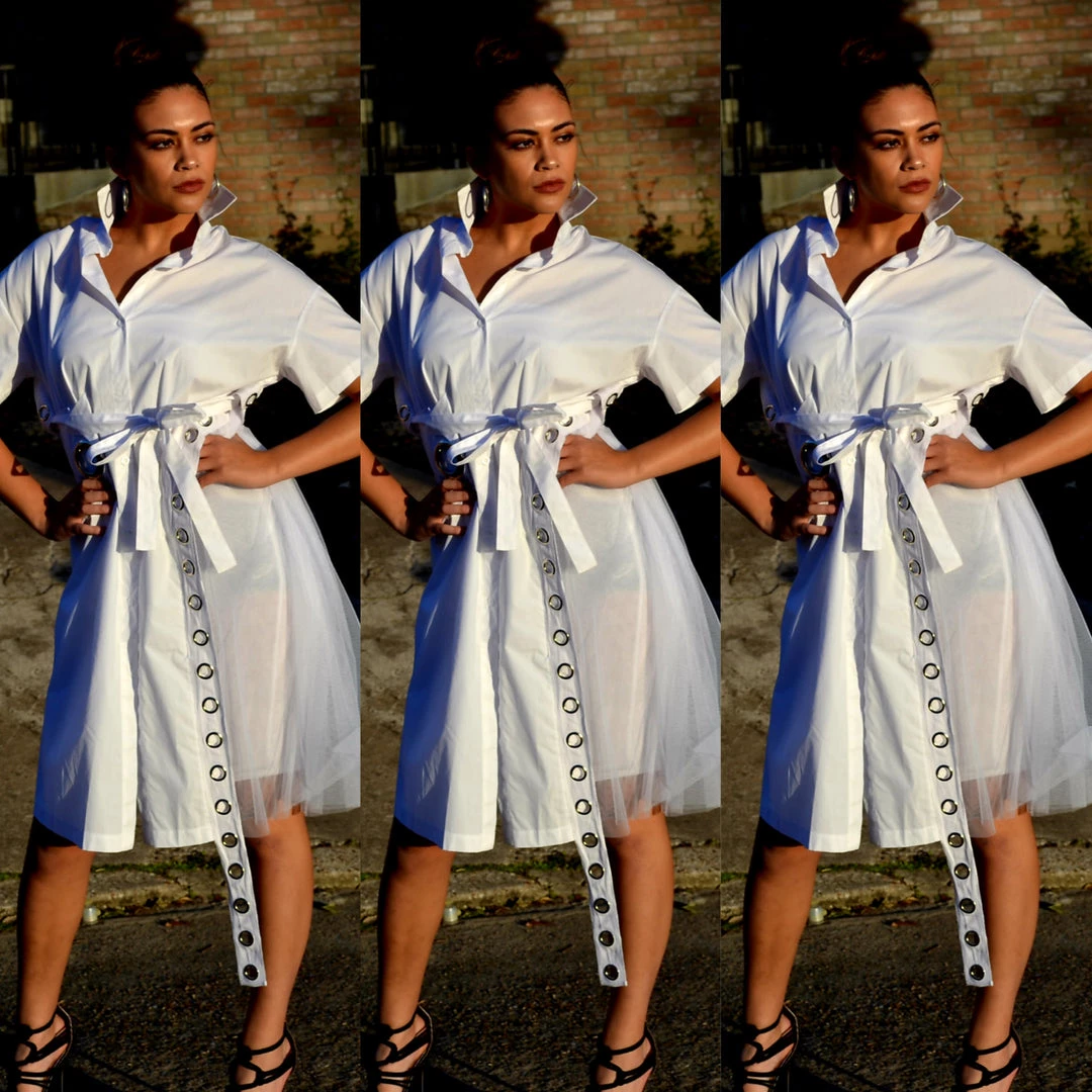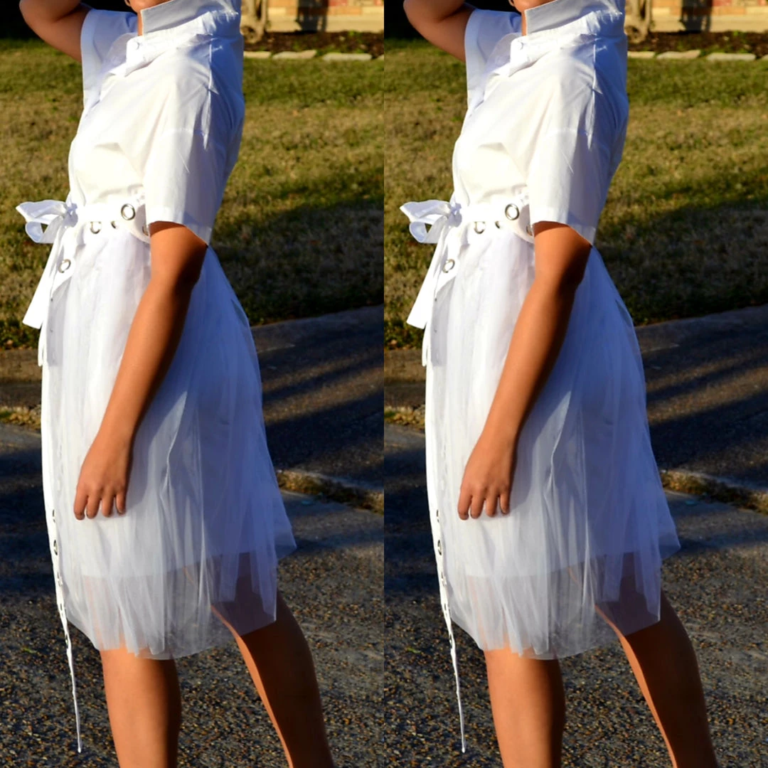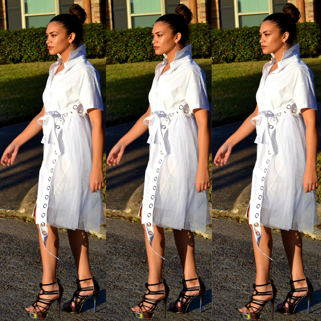 White top is shown with the shite straps tied around the waist as a belt. White is also shown with a white tube top dress worn underneath. Top is sheer see through tulle on the bottom. Need to dress up but you don’t want to fade into the crowd or be over dressed either? Then wearing this black button down style top will surely make you stand out and be seen while still being comfortable and chic. While everyone is checking you out, you’ll be cool, comfy and confident because this top brings out your true effortless beauty. Top is a soft cotton fabric perfect for those spring/summer days. Wear with heels or sandals and you will be good to go. Top is very generous in sizing and is designed to fit loose and full. Silver grommet details makes the look super edgy. Back of the top is sheer and front pocket detail. Ships from Houston, Texas by Social Butterfly Collection.