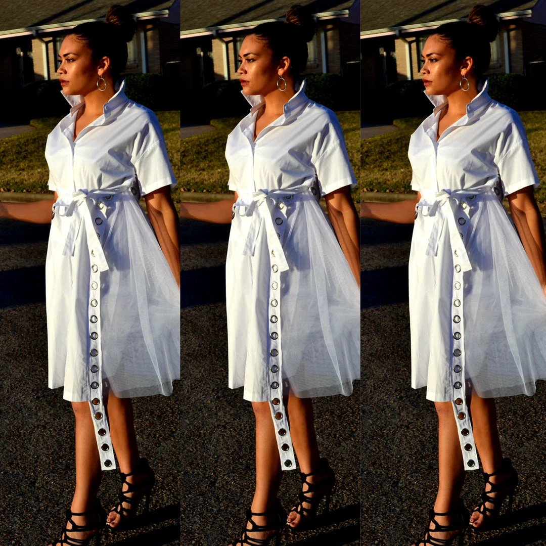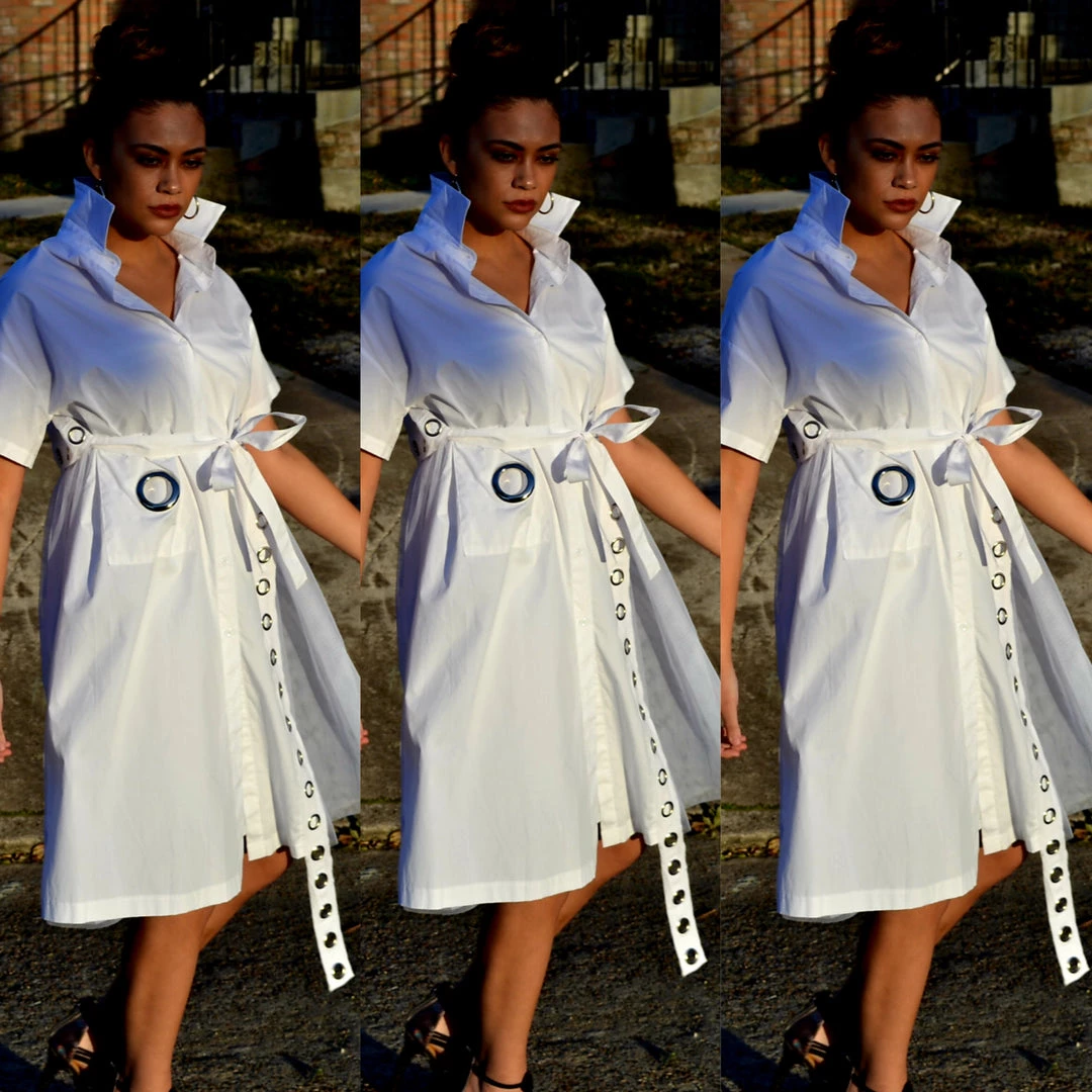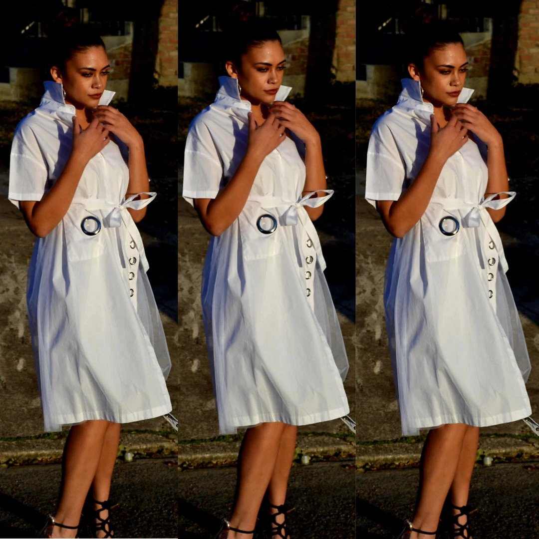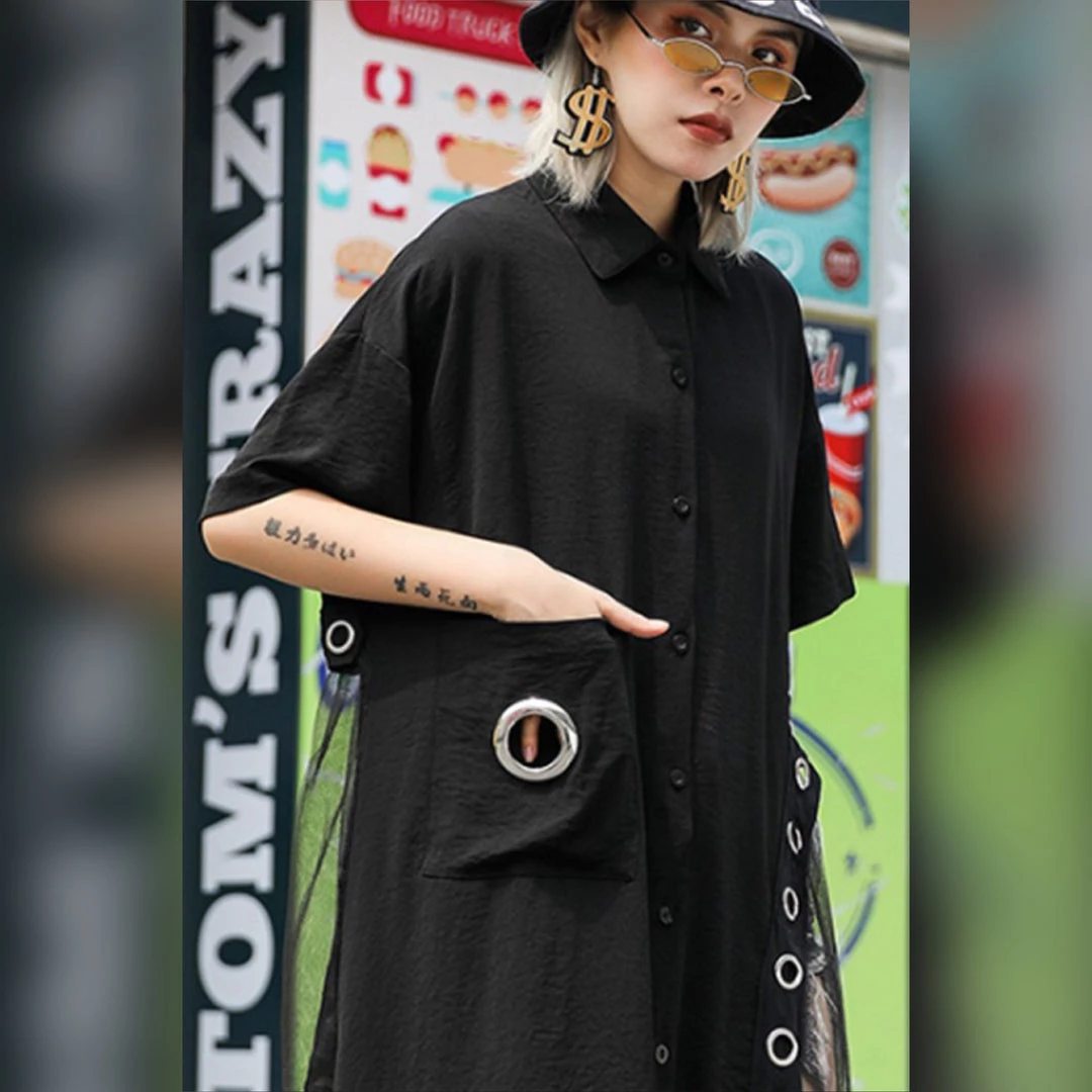 White top is shown with the shite straps tied around the waist as a belt. White is also shown with a white tube top dress worn underneath. Top is sheer see through tulle on the bottom. Need to dress up but you don’t want to fade into the crowd or be over dressed either? Then wearing this black button down style top will surely make you stand out and be seen while still being comfortable and chic. While everyone is checking you out, you’ll be cool, comfy and confident because this top brings out your true effortless beauty. Top is a soft cotton fabric perfect for those spring/summer days. Wear with heels or sandals and you will be good to go. Top is very generous in sizing and is designed to fit loose and full. Silver grommet details makes the look super edgy. Back of the top is sheer and front pocket detail. Ships from Houston, Texas by Social Butterfly Collection.