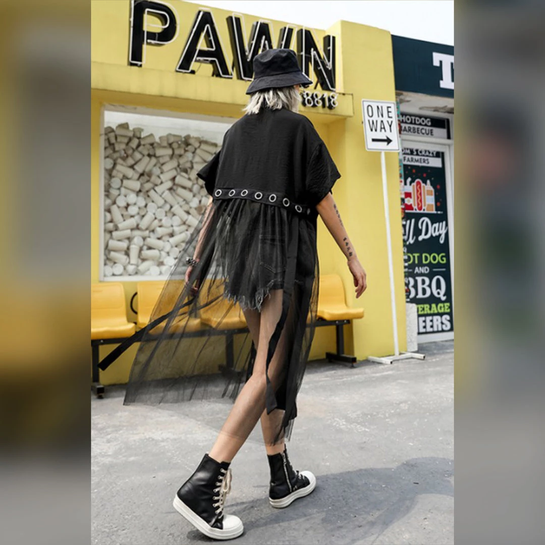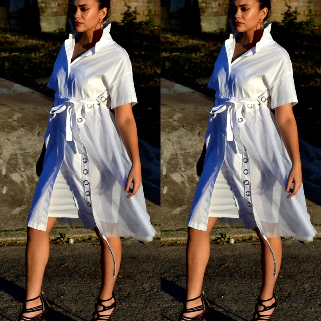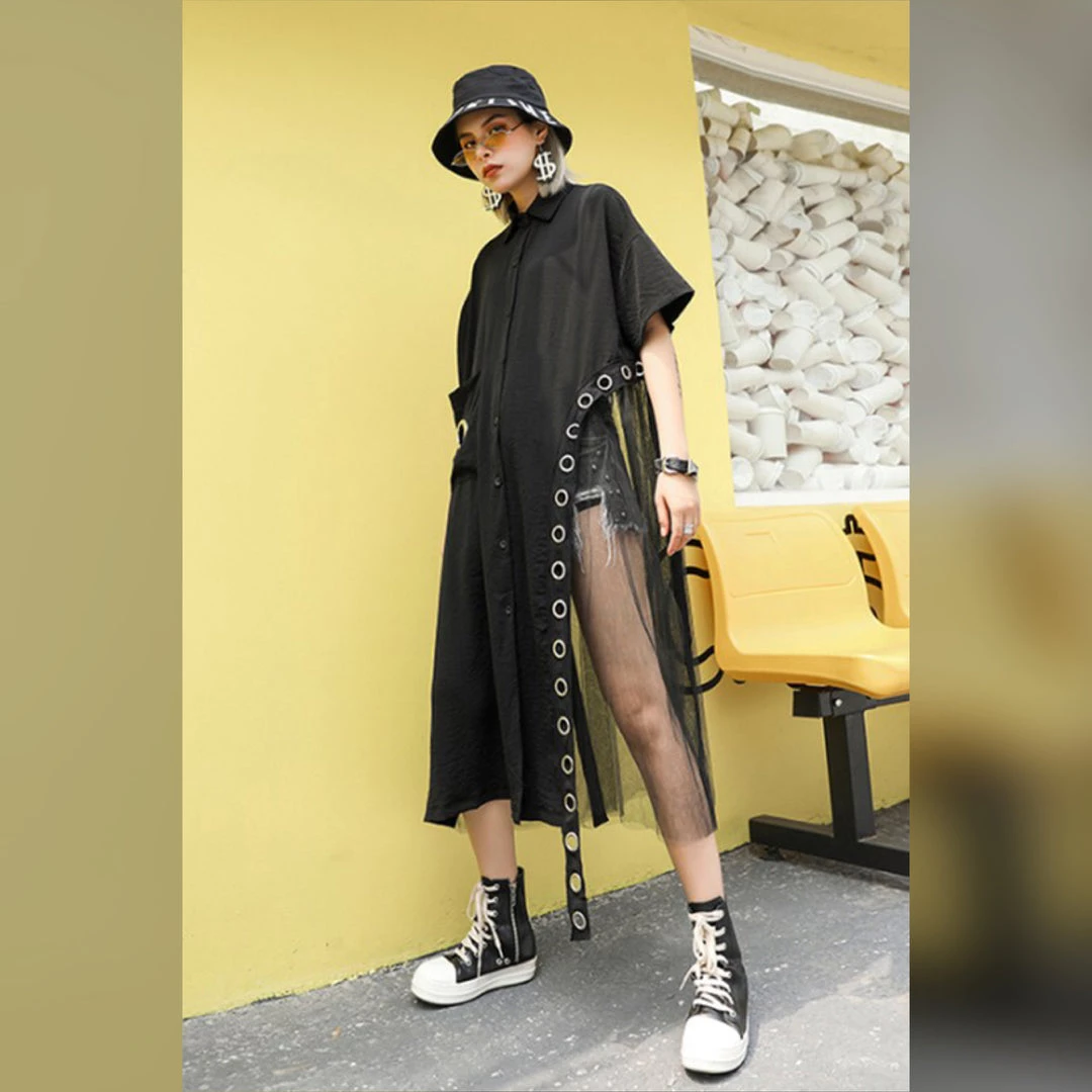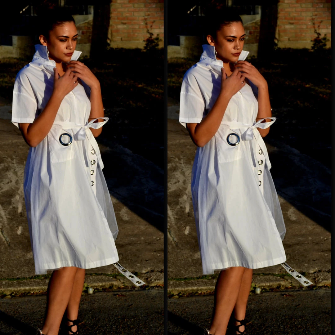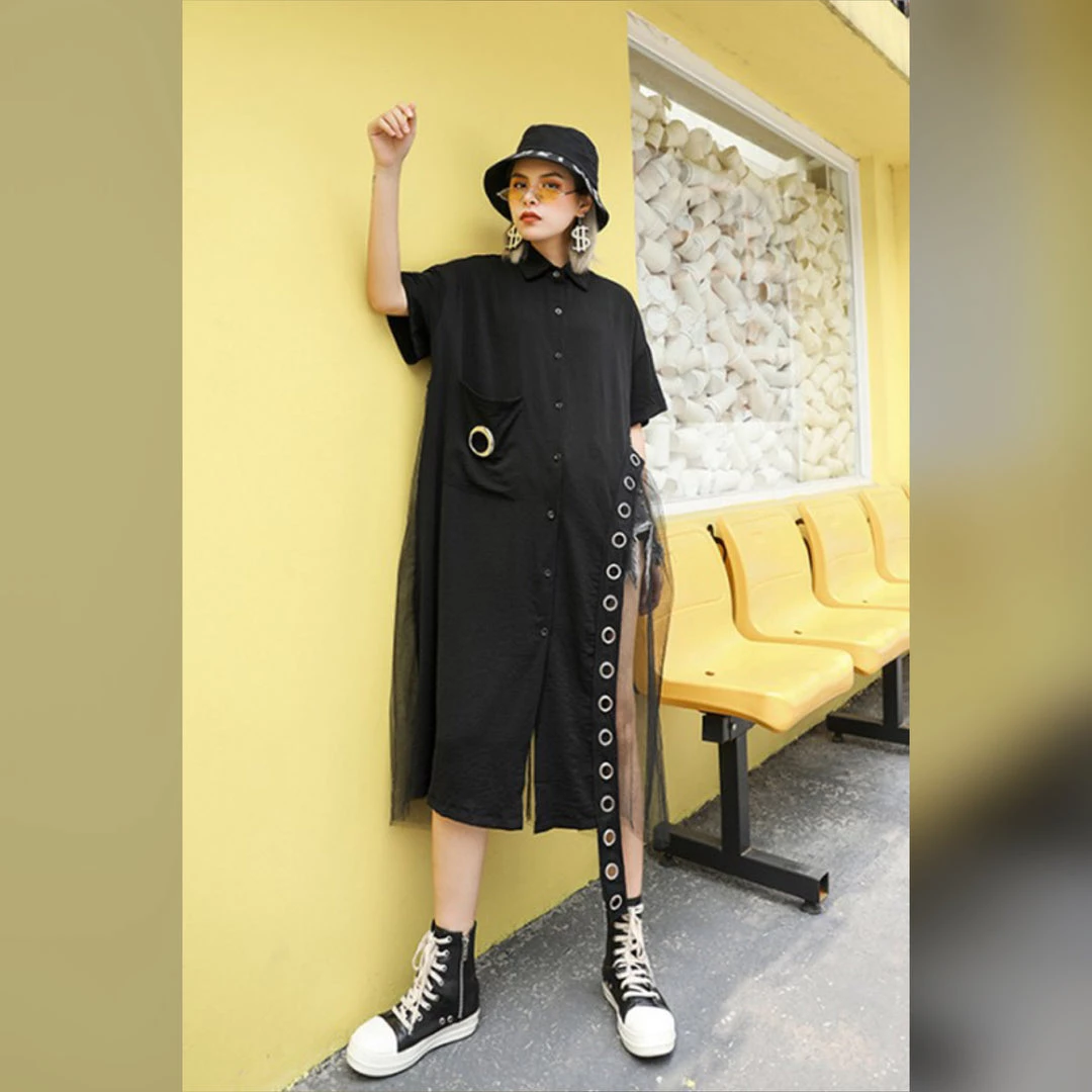 White top is shown with the shite straps tied around the waist as a belt. White is also shown with a white tube top dress worn underneath. Top is sheer see through tulle on the bottom. Need to dress up but you don’t want to fade into the crowd or be over dressed either? Then wearing this black button down style top will surely make you stand out and be seen while still being comfortable and chic. While everyone is checking you out, you’ll be cool, comfy and confident because this top brings out your true effortless beauty. Top is a soft cotton fabric perfect for those spring/summer days. Wear with heels or sandals and you will be good to go. Top is very generous in sizing and is designed to fit loose and full. Silver grommet details makes the look super edgy. Back of the top is sheer and front pocket detail. Ships from Houston, Texas by Social Butterfly Collection.