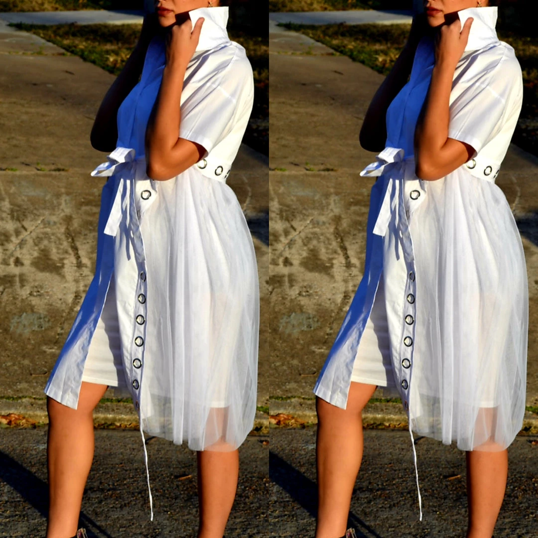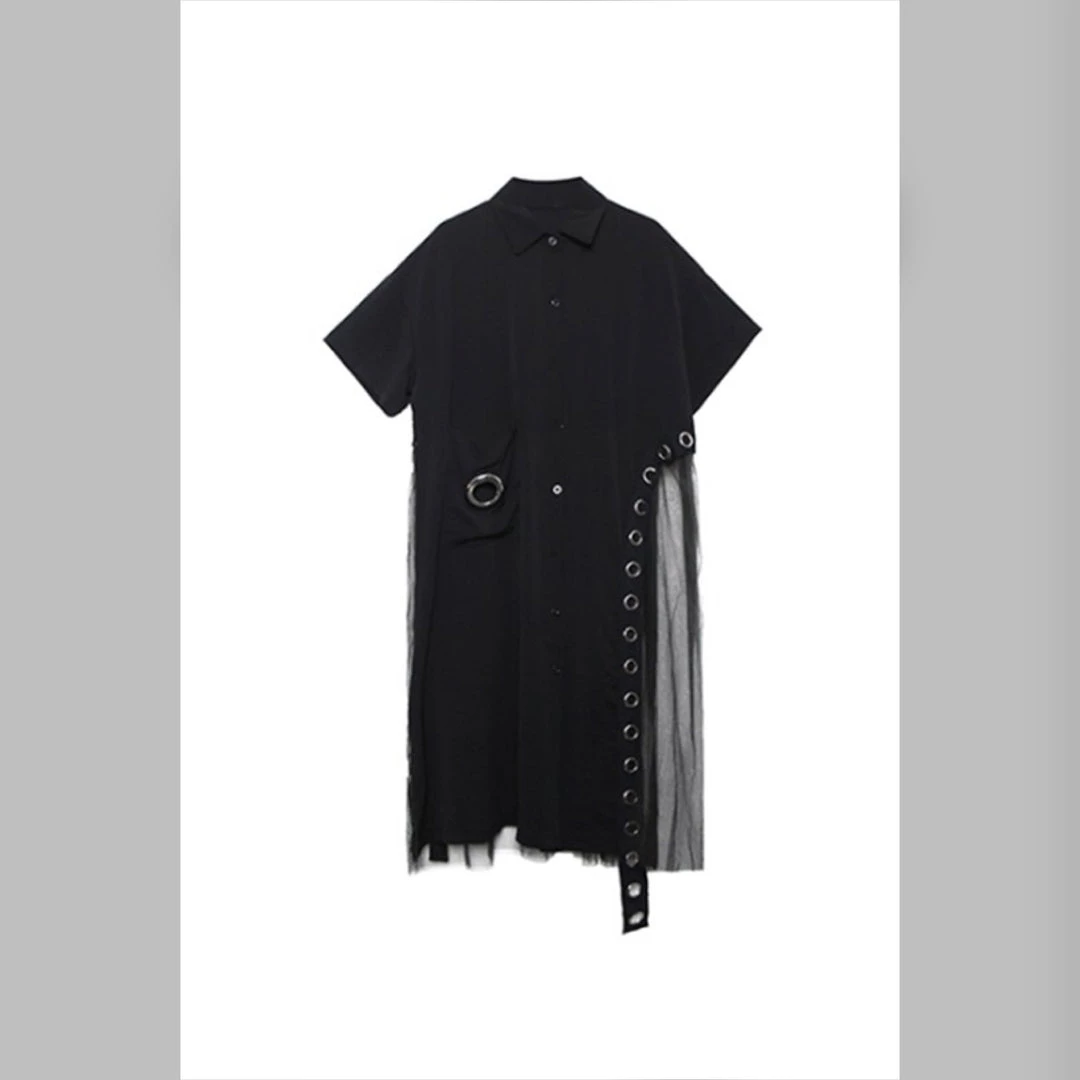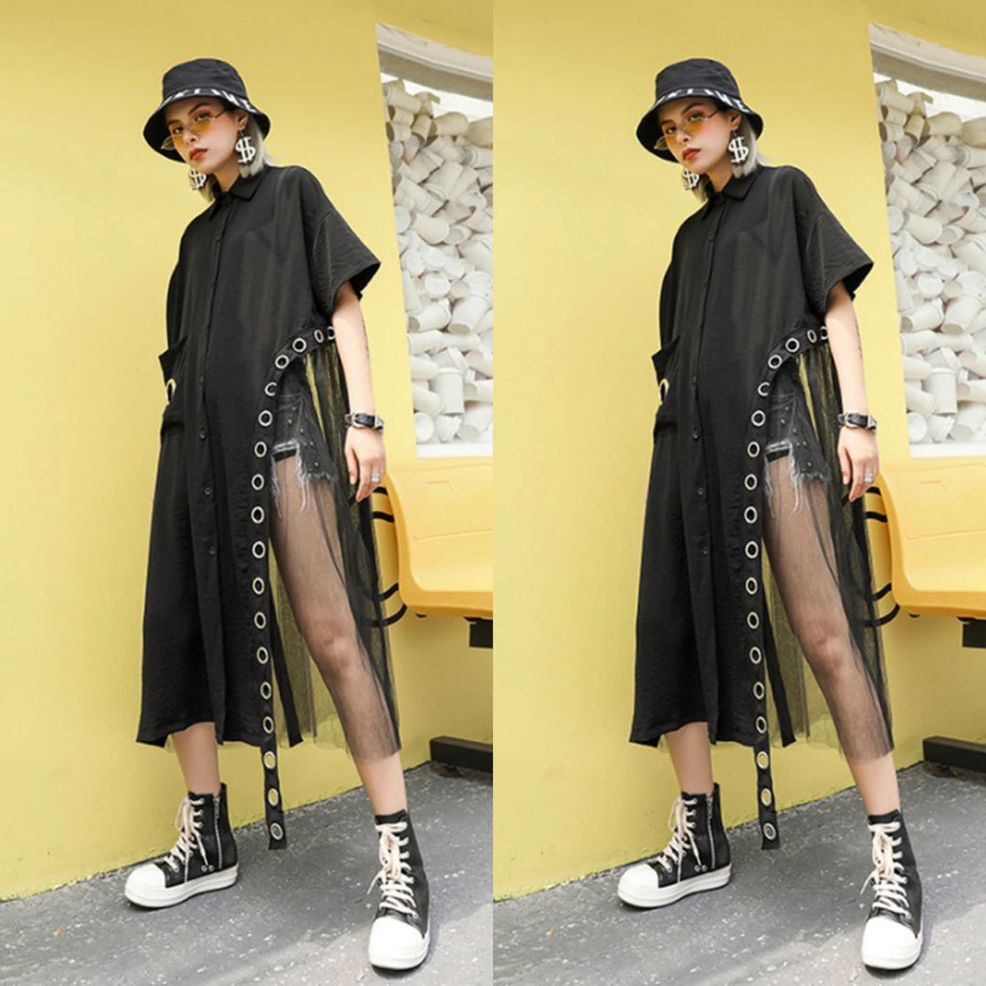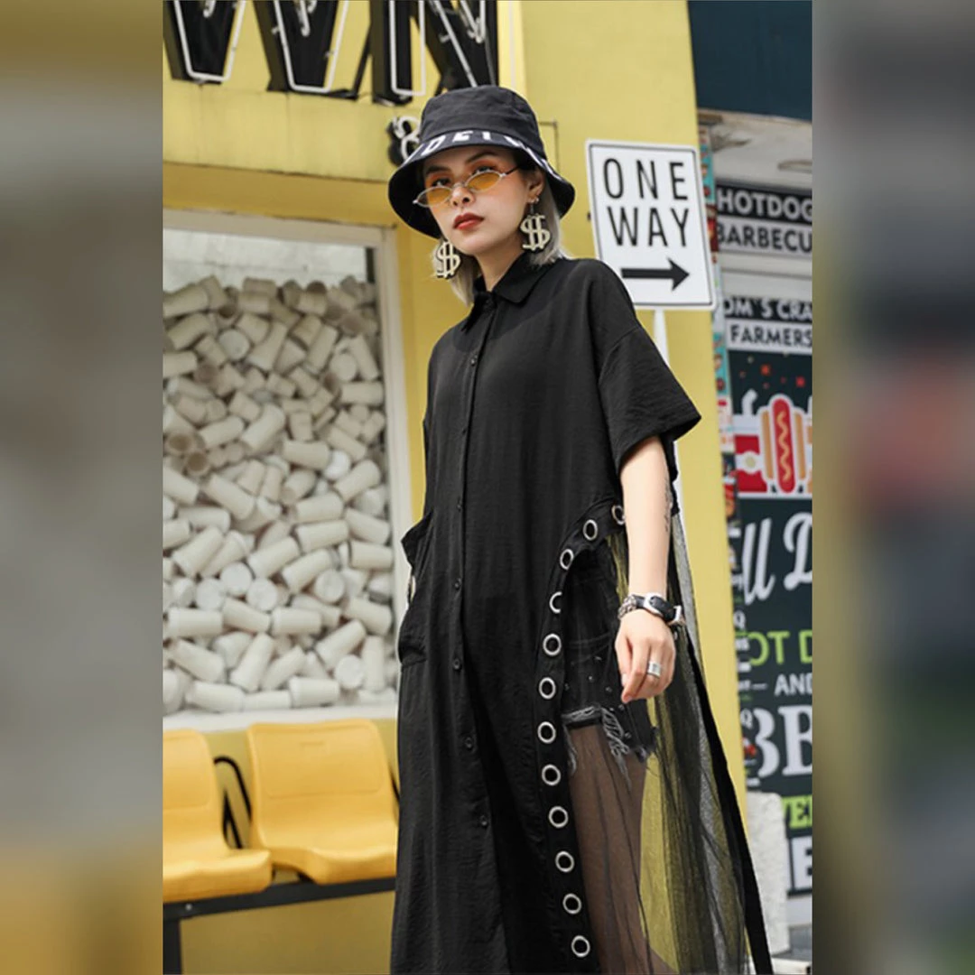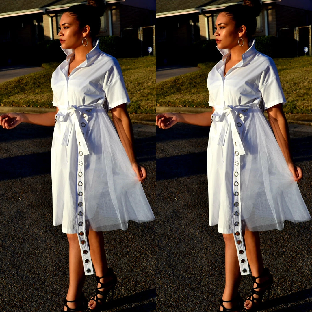 White top is shown with the shite straps tied around the waist as a belt. White is also shown with a white tube top dress worn underneath. Top is sheer see through tulle on the bottom. Need to dress up but you don’t want to fade into the crowd or be over dressed either? Then wearing this black button down style top will surely make you stand out and be seen while still being comfortable and chic. While everyone is checking you out, you’ll be cool, comfy and confident because this top brings out your true effortless beauty. Top is a soft cotton fabric perfect for those spring/summer days. Wear with heels or sandals and you will be good to go. Top is very generous in sizing and is designed to fit loose and full. Silver grommet details makes the look super edgy. Back of the top is sheer and front pocket detail. Ships from Houston, Texas by Social Butterfly Collection.