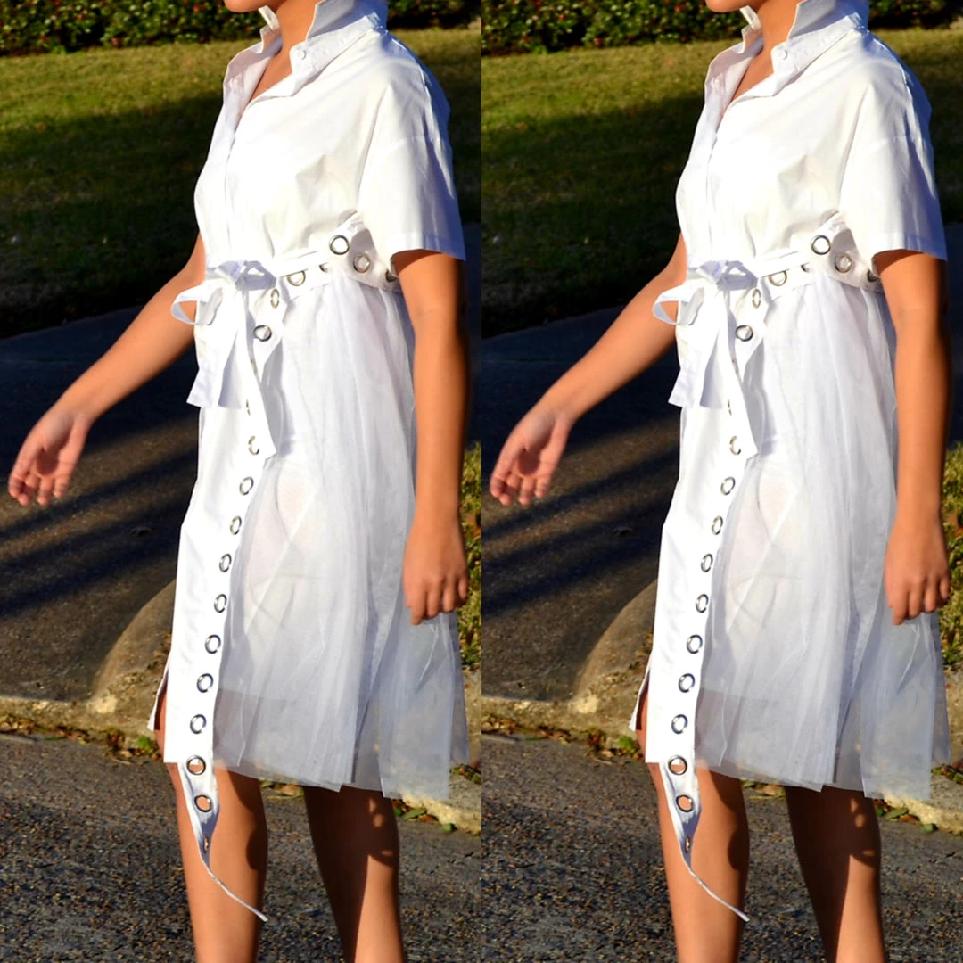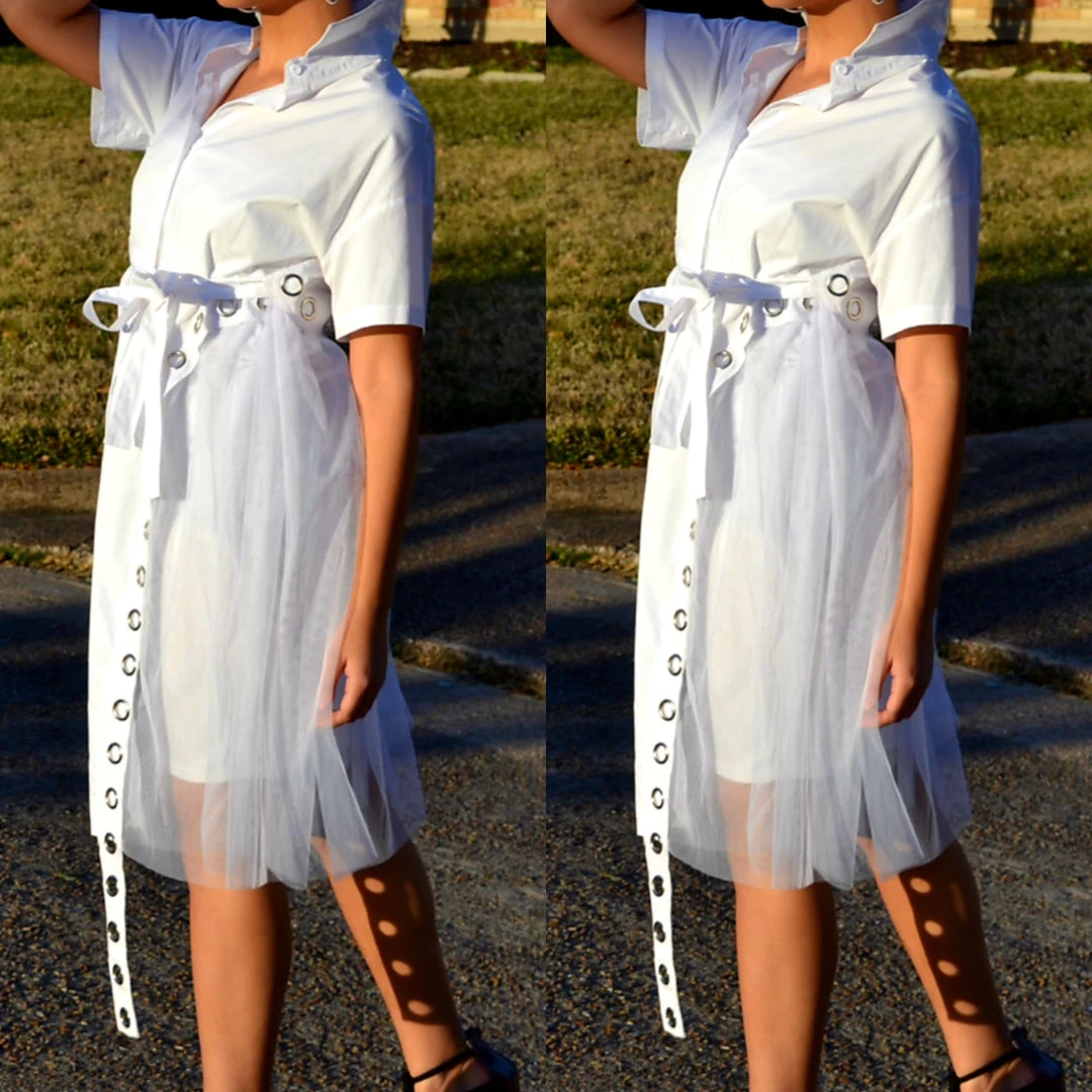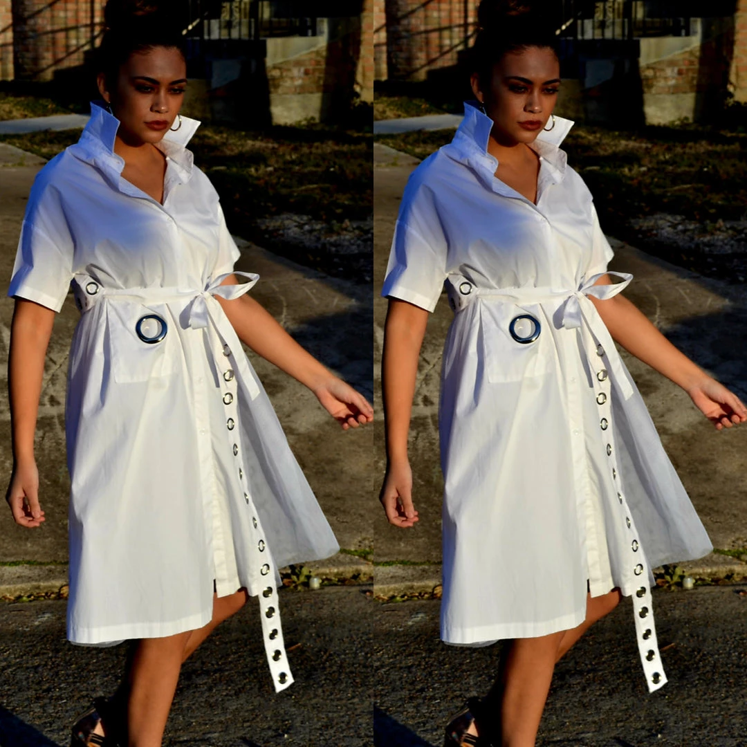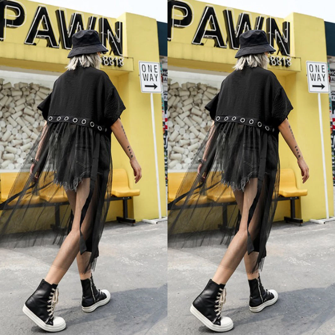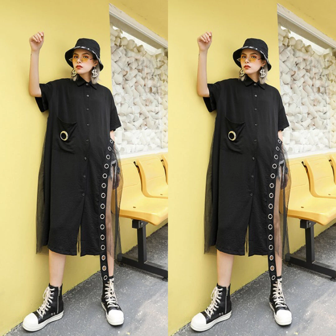 White top is shown with the shite straps tied around the waist as a belt. White is also shown with a white tube top dress worn underneath. Top is sheer see through tulle on the bottom. Need to dress up but you don’t want to fade into the crowd or be over dressed either? Then wearing this black button down style top will surely make you stand out and be seen while still being comfortable and chic. While everyone is checking you out, you’ll be cool, comfy and confident because this top brings out your true effortless beauty. Top is a soft cotton fabric perfect for those spring/summer days. Wear with heels or sandals and you will be good to go. Top is very generous in sizing and is designed to fit loose and full. Silver grommet details makes the look super edgy. Back of the top is sheer and front pocket detail. Ships from Houston, Texas by Social Butterfly Collection.